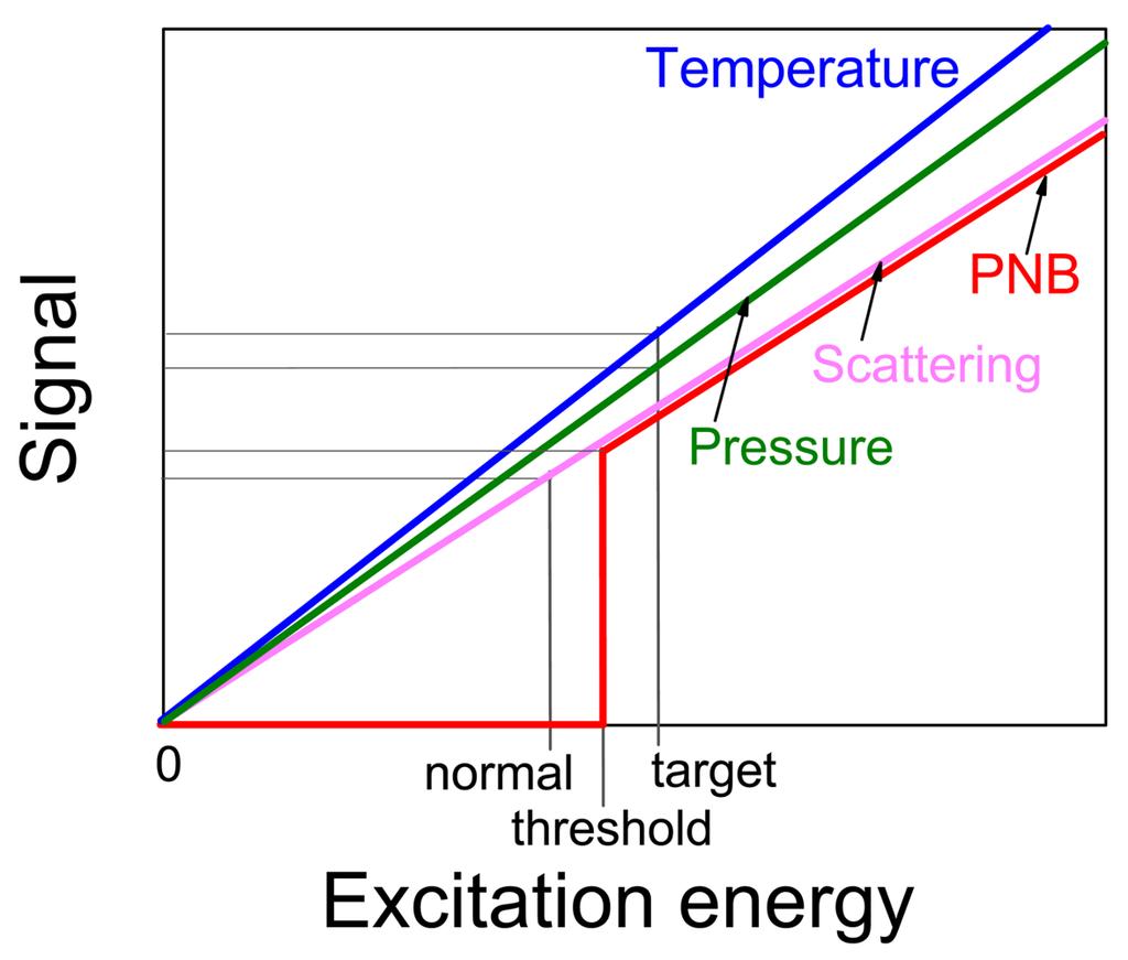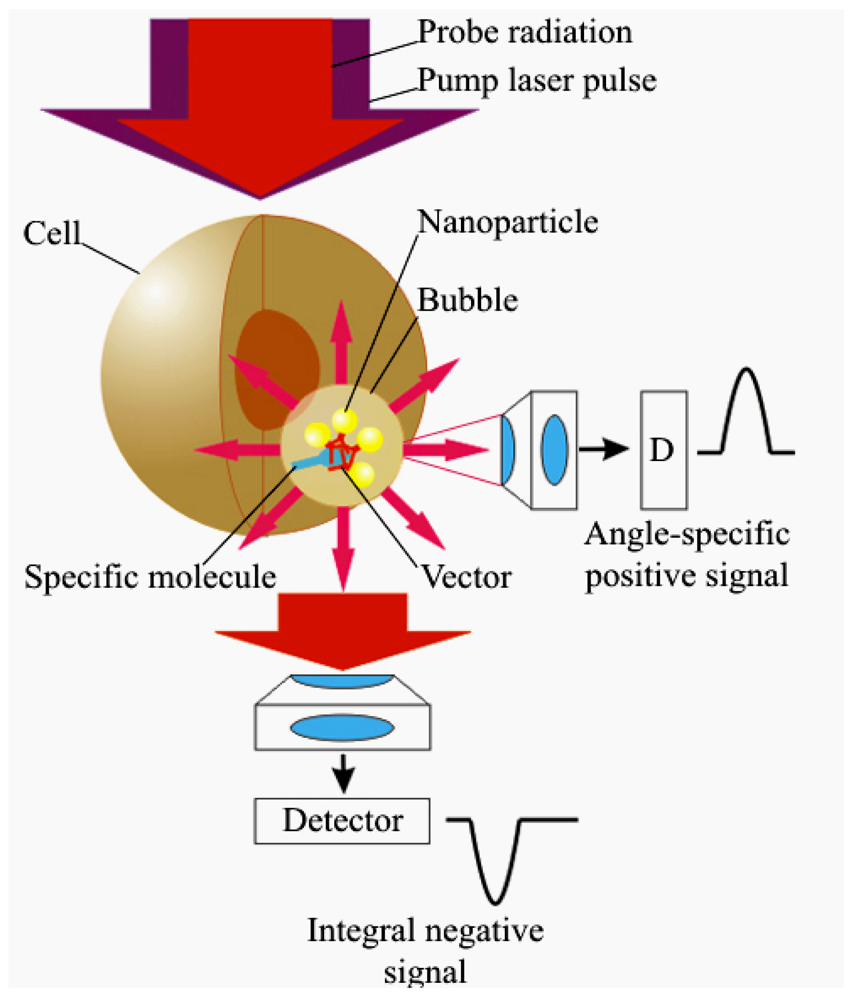 In terms of distinguishing the target and non-specific cells the threshold mechanism of PNB generation increases the contrast and specificity of their detection: assuming that the NP clusters in target cells will be larger than those in non-specific cells we may adjust the excitation (pump) fluence to the level that exceeds the PNB threshold for target cells though is below much higher PNB threshold for non-specific cells. In this case PNB s will be generated only in target cells. Another methods use non-threshold processes for cell imaging (photothermal, photoacoustic, fluorescent, scattering) and, therefore, provide only incremental difference in the signals between target and non-specific cells with much lower specificity compared to qualitative difference between PNB-positive and PNB-negative cells (Figure 13).