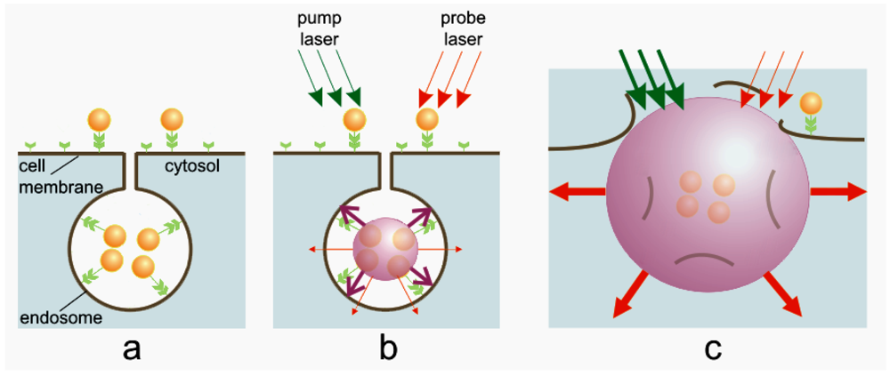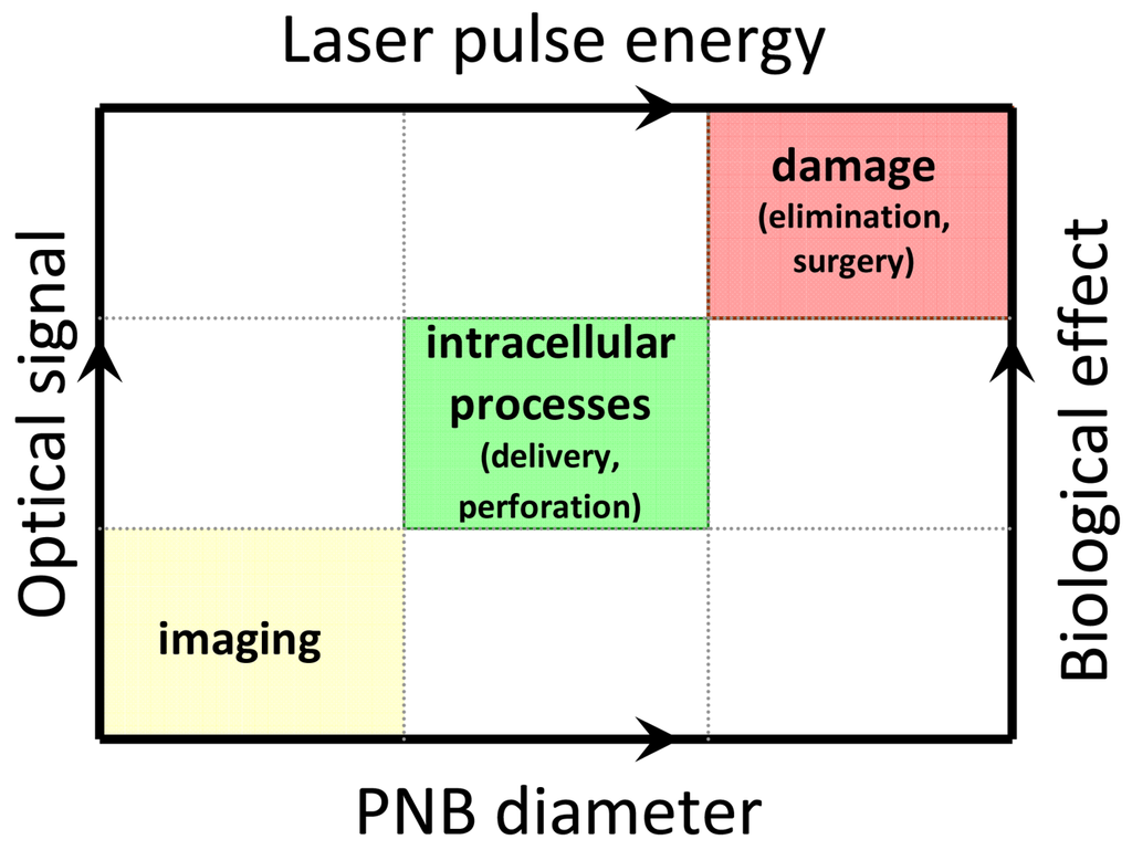 The dependence of the diagnostic (optical) and therapeutic (mechanical) effects of a plasmonic nanobubble upon its diameter creates a unique opportunity for real-time (dynamic) tuning and remote monitoring of the biological effect of a PNB in an individual cell in vitro and in vivo by varying the PNB diameter through the pump laser pulse fluence (Figure 14). We suggest that PNBs with a diameter smaller than 300 nm are nonlethal to living cells and are applicable to non-invasive imaging. Those in the range of 400 -1000 nm produce local reversible mechanical impact and be applicable to delivery and other manipulation at sub-cellular level without irreversible damage to the cell. PNBs larger than 1 μm mechanically and irreversible damage the cell and can support therapeutic applications. We consider the dynamic tunability of the PNB as the central strategy for new biomedical applications that include theranostics as well as nano-and micro-surgery [119,120] and intracellular targeting [119].