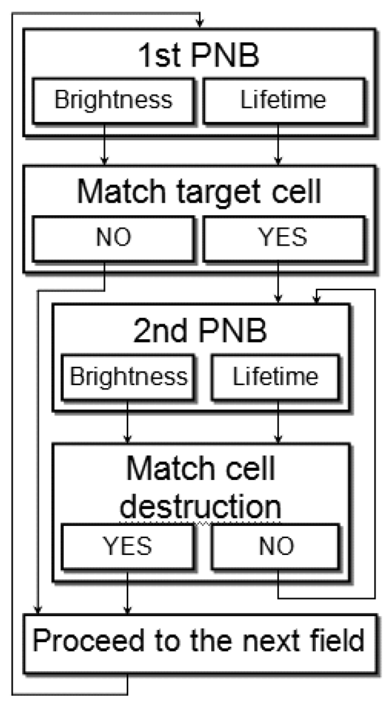 The theranostic algorithm in individual cells was designed in order to discriminate between normal and diseased cells. We describe an automated algorithm that combines diagnostic and ablative modes through immediate feedback to detect and kill a target cell. This algorithm (Figure 16) probes the cells with a range of laser fluences and employs two sequential pulses: the first PNB detects the cell, and if its lifetime (or brightness) match the window for the target cell, the second PNB of increased diameter is rapidly generated after the first one for the therapeutic ablation by immediately increasing the fluence of the laser pulse above the cell damage threshold (Figure 16). The threshold fluence of PNB generation was found to be lower than the biological damage threshold fluence [85,96]. Therefore, by varying the fluence of the laser pulse from sub-lethal to lethal levels, we can efficiently switch from a non-invasive to an ablative mode.