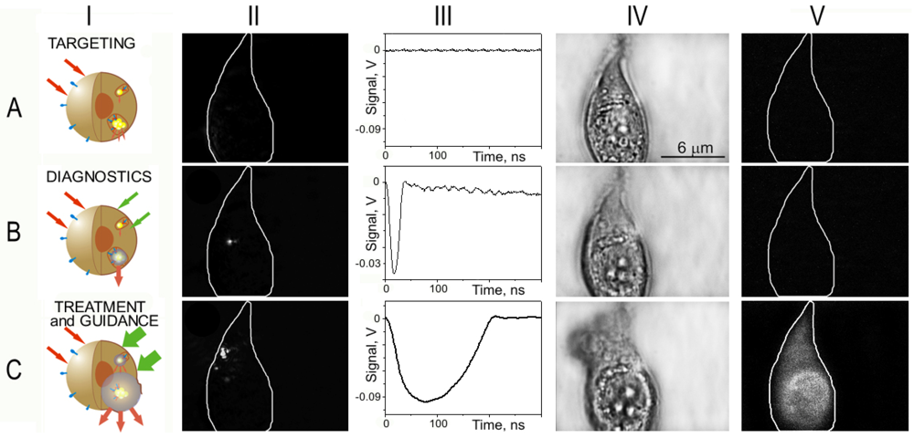 Modern cancer research and treatment have several principal challenges. The first barrier in current clinical practice is the separation of diagnosis, therapy and therapy guidance into three independent stages. This both impedes treatment procedures and reduces their accuracy. Theranostics was recently introduced as a concept combining diagnosis and treatment [1-4]. Its successful realization will result in a significant improvement in both rapidity and precision in medical practice. The second limitation is the low sensitivity and specificity of current diagnostics and therapeutics that often cannot selectively identify and treat disease-specific cells and thus cannot support early-stage diagnosis and treatment. Being able to detect and treat disease selectively at cell level will result in earlier interventions and far higher treatment success rates. This requires a method and probe (agent) with tunable and multiple functions at the level of individual cells. The initial developmental phase of theranostics already revealed that such probes have not yet been developed [1-4]. Current probes do not provide true cell theranostics due to the limited tunability of the functions (diagnostic, therapeutic and guidance) of such agents as fluorescent and luminescent probes [2,5-11], micelles, polymers and liposomes [12-18], nanoparticles [2,6-8,19-24], plasmonic gold nanoparticles [2,3,25-35] and gas-filled and cavitation bubbles [36-49]. Despite widespread efforts, none of the above probes can be tuned in cells so as to support diagnosis, therapy and its guidance in a single process, with one probe, and at cell level. The specific function (diagnostic or therapeutic) of the nanoparticle is pre-set during its fabrication and cannot be changed after its delivery into the cell. So far the theranostic function was mainly achieved by combining several particles and molecules (each one supporting its specific function) into a single complex one. Examples of these are fluorescently labeled liposomes containing a drug, or micelles with a drug and a fluorescent label. Nanotechnologies were employed to address the above problems, but, despite the promise of the properties of nanoparticles, they still often use macroscale, rather than nanoscale processes and methods. This can be seen from the diagnostic and therapeutic applications of gold nanoparticles where the diagnosis is supported by optical scattering and the treatment is due to photothermally induced hyperthermia. Both phenomena high loads of nanoparticles in a target in order to provide diagnostic and therapeutic action, and thus their spatial scale is far bigger than “nano” [28-31,33,50-54]. This limits the accuracy, efficacy and safety of their medical applications.