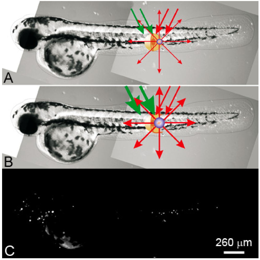 We developed a novel in vivo model by using zebrafish. The zebrafish is a vertebrate organism that is relatively optically transparent, develops quite fast and is physiologically similar to humans. The zebrafish was already evaluated for analysis of the distribution and toxicity of plasmonic (gold) NPs [123-125] and also allowed efficient optical manipulations including laser microsurgery and sensing [126-130]. These findings allowed us to consider zebrafish embryos for plasmonic nanomedicine (optical scattering diagnosis, photothermal diagnosis and therapy, ultrasound and optical methods for drug delivery, cell manipulation and surgery). Furthermore, the zebrafish is a model for diverse cancers [131-136], which are promising targets for plasmonic therapies. Therefore, the zebrafish has an excellent potential for nanophotonic medicine.