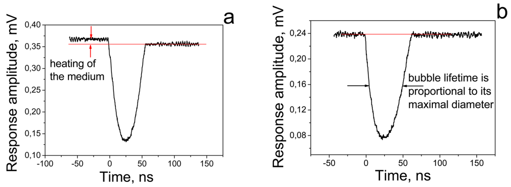 The mechanism of plasmonic nanobubble generation has several unique physical properties. Firstly, the location of the PNB is precisely determined by the location of the plasmonic NPs: a PNB will not emerge in an NP-free space, and this significantly improves the control of the PNB parameters (location, size and brightness) compared to any other laser-induced bubbles in cells and tissues. Secondly, the thermal impact of a PNB on the environment is minimal. This impact was experimentally analyzed through the time-responses of the laser-irradiated samples. The shape, amplitude and duration of optical time-response were earlier shown to directly characterize the phase state and the temperature elevation in a local volume that is exposed to the excitation laser pulse and is optically monitored with an additional probe laser [55,58]. We compared the time-responses of laser-heated homogeneous molecular solution and of gold NPs [57]. The photothermal effect in light-absorbing solution always included the two components, heating of the medium and bubble formation (Figure 2a). The two arrows in Figure 2a show the deviation of the post-bubble signal from the baseline due to residual heating of the surrounding medium. In the case of PNBs, no heating of the medium outside the bubble or after its collapse was observed (Figure 2b): the time response of the probe laser signal did not show any deviation from the background level. This difference can be explained by the insulating properties of the vapor around heated NPs: the low thermal conductivity of the vapor locks all the heat inside the bubble and thus prevents thermal impact on the environment. After the bubble collapse, the thermal impact is prevented by NPs that accumulate the additional thermal energy created during the bubble collapse. Therefore, PNBs differ in principle from both conventional photothermal bubbles and from plasmonic NPs. The latter are used for hyperthermia, as they convert optical energy and produce environmental temperatures below boiling point, thus delivering the heat into a significant amount of the surrounding volume. Only a PNB provides real concentration of the photothermal effect at nanoscale. As a result the impact of the PNB has a mechanical, non-thermal nature.