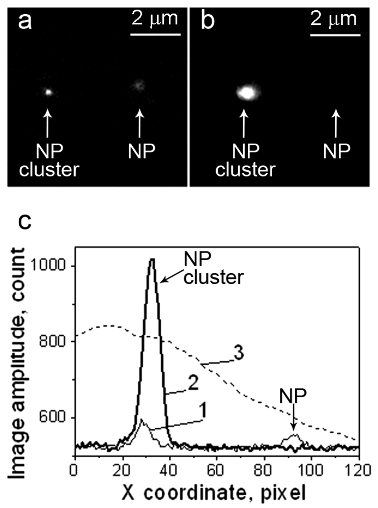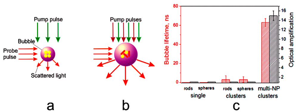 Depending upon the size of the bubble, it will attenuate or will amplify optical scattering. We recently verified this property of PNBs in experiments with gold NPs and their clusters in water [56,57] and in living cancer cells [85]. The cluster mechanism of PNB generation demonstrates the dependence of PNB brightness upon the NP clusterization state (Figure 7). Compared to gold NPs at room temperature (cold), we found that at high laser-induced temperatures, the properties of “hot” gold NPs are mainly determined by the properties of the two-phase (vapor-liquid) environment, in other words, by the properties of PNBs. As a result, the optical properties of the nanoparticle-bubble system are strongly influenced by the bubble generation: the optical attenuation around single NPs in Figure 7b, and the optical amplification by 12-times around an NP cluster (Figure 7b). The bubble also improves the optical contrast of NP clusters compared to single NPs by 27-times [56].