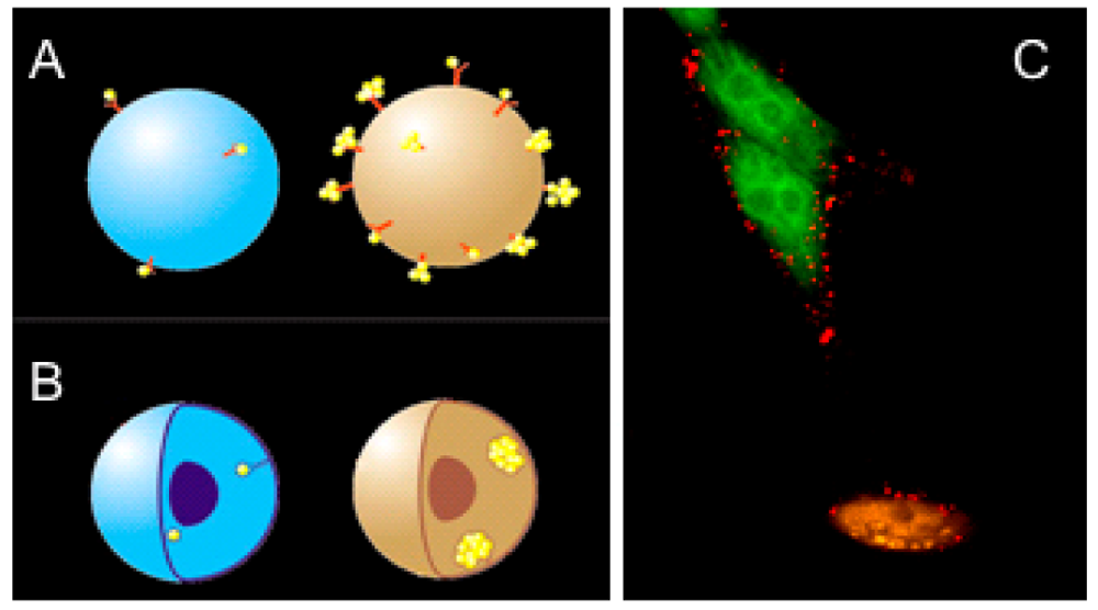 Firstly, the NPs are covalently conjugated to the disease-specific antibody that attaches the NPs to the matching receptors at the surface of the cellular membrane during their incubation with the NP conjugates. This provides the accumulation of the NPs in a cell but shows limited selectivity due to the non-specific coupling of the NPs to normal cells or to cells with low levels of the expression of similar receptors (Figure 4a and 4c, Figure 5a).