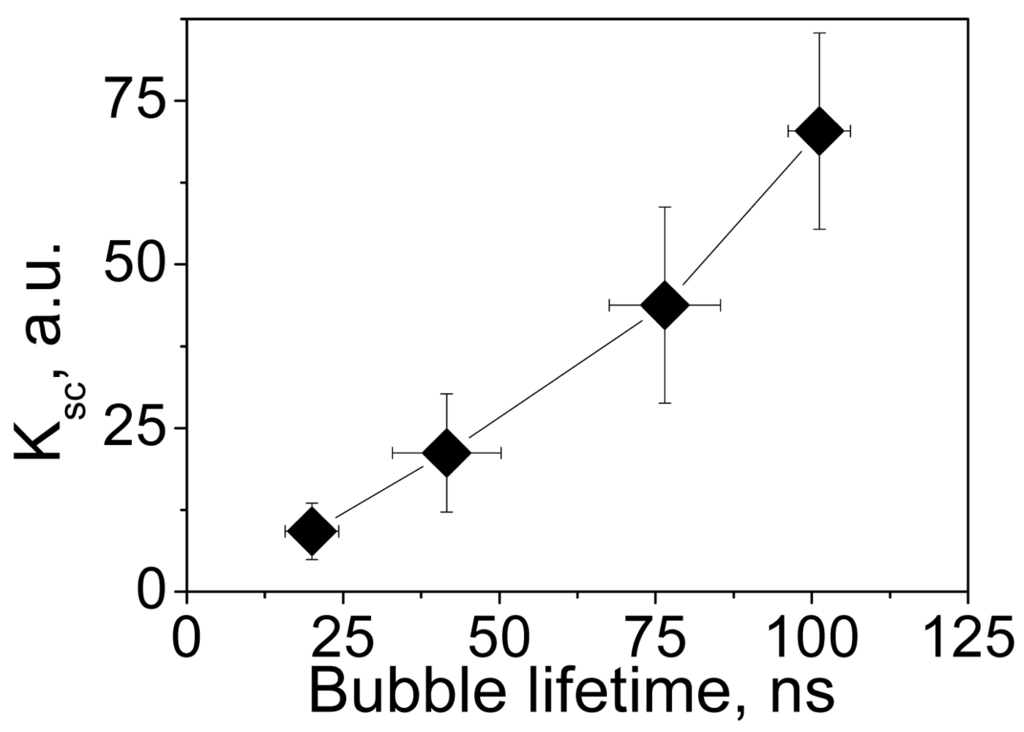 The brightness of a PNB can be dynamically tuned with an excitation laser pulse through its fluence level (see p. 1.5 below). For a quantitative analysis of the optical amplification by PNBs relative to optical scattering by gold NPs, we have introduced the relative scattering image amplitude Ksc(t) = [I(t) − Ib]/[I(0) − Ib] that describes the pixel image amplitude I(t) of optical scattering by a PNB, relative to that by an NP I(0) (Ib is the average pixel image amplitude of the background). Figure 9 shows the dependence of the optical amplification of PNB optical scattering upon the maximal size of PNB that is controlled through the laser fluence.