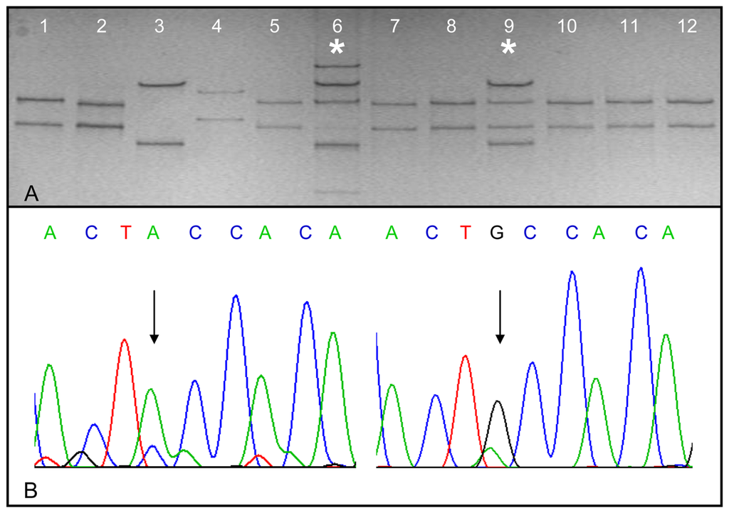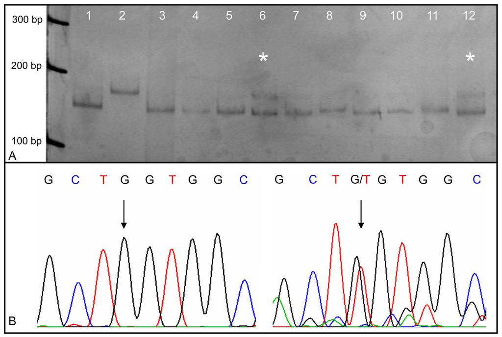 K-Ras gene mutations were screened by RFLP analysis according to the method described by Schimanski et al. [40]. Briefly, 2 μL of the whole genome amplification product (100–300 ng genomic DNA) obtained by using the REPLI-g Mini Kit were PCR-amplified with the oligonucleotide primer pair Ras A and Ras B [19], generating a 166 bp amplicon. The mismatch primer Ras A hybridizing with codons 2–11 of the K-Ras gene exon 1 introduces a restriction site for BstXI or XcmI into the amplicon. In case a template is mutated in codon 12 or 13, the restriction site is lost. The subsequent enzymatic restriction of the wild-type K-Ras leads to an enrichment of mutated DNA strands. Gel bands, the size of the mutated control fragments, were cut out and sequenced. Figure 2 illustrates a typical RFLP analysis of the K-Ras gene and the corresponding sequencing profile of the shifted band.