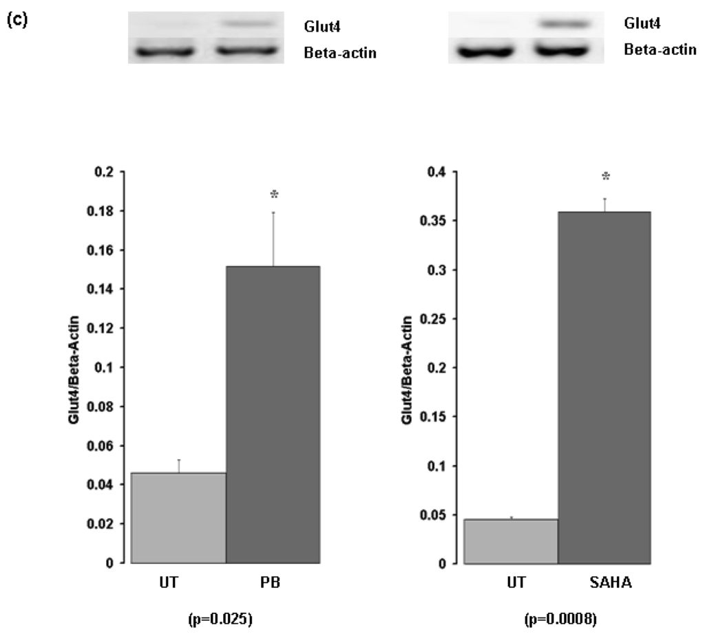 Subsequently we examined the response of Glut-4 to TSA with two other histone deacetylase inhibitors, Phenylbutyrate (PB), and the FDA approved HDAC inhibitor suberoylanilide hydroxamic acid (SAHA –Vorinostat) (Figure 1). We confirmed the initial observation that Glut-4 expression can be induced or increased following inhibition of histone deacetylases (Figure 1).