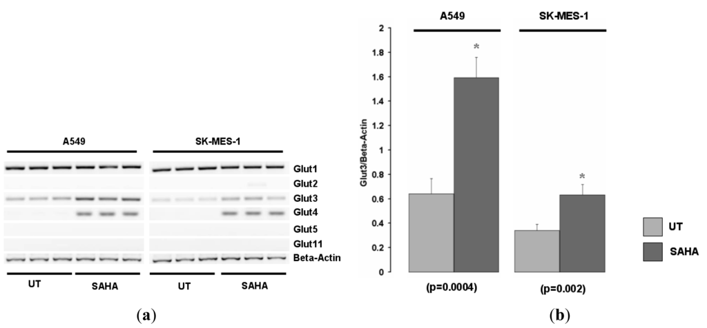 We examined the expression of various other Glut family members in the A549 and SK-MES-1cell lines for responses to HDACi. Glut1 was expressed in both cell lines but was not induced by SAHA (Figure 2a, and data not shown). Of the other Glut family members screened, Glut-3 was also found to be increased in these cell lines in response to HDAC inhibition (Figure 2b).