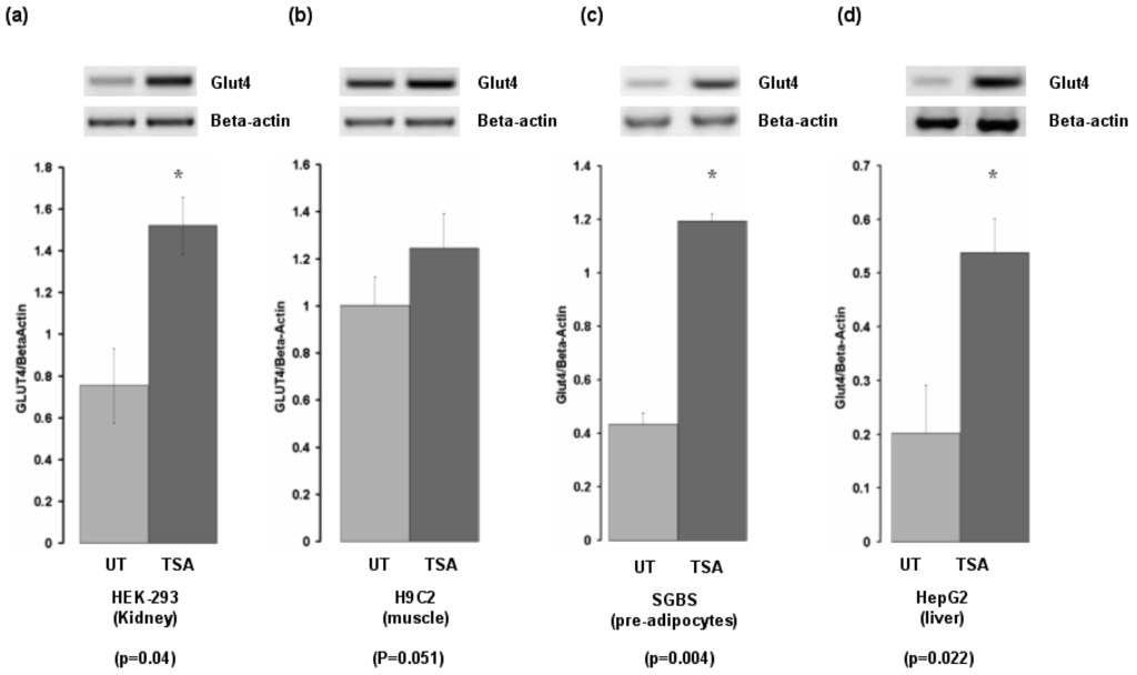 As both tissue and inhibitor specific responses have been demonstrated to occur for HDACi [17], we examined the effect of TSA on Glut-4 expression in cell lines from organs important for insulin-mediated responses. Glut-4 was induced in cells derived from liver, pre-adipocytes, kidney, but was not induced in cells derived from skeletal muscle (Figure 3).
