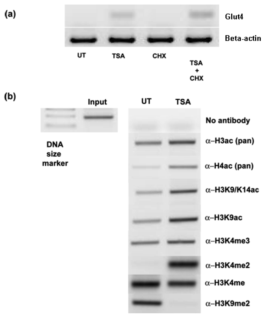 To see if the induction/upregulation of Glut-4 was a direct consequence of HDAC inhibition, cells were exposed to cycloheximide prior to TSA treatments. Pretreatment with cycloheximide did not prevent the induction of Glut-4 mRNA (Figure 4a), suggesting that de novo protein synthesis was not required for the upregulation of Glut-4, and that direct chromatin remodeling of the Glut-4 promoter was occurring. To confirm that the observed effects of HDAC inhibition were due to increased histone hyperacetylation at the promoter of Glut-4, we carried out chromatin immunoprecipitation (ChIP) analysis at the Glut-4 promoter in A549 cells treated with TSA. A no-antibody control was included to test for non-specific carriage of DNA with histones. As can be seen in Figure 4b, treatment with TSA results in an increase in the amount of PCR product for Glut-4 indicating an increase in histone hyperacetylation around its promoter. Using specific antibodies we show that lysine 9 and lysine 14 are hyperacetylated in this region following treatment with TSA, and clearly demonstrate that chromatin remodeling is directly involved with the activation of Glut-4. Interestingly, no enhancement of histone trimethylation on lysine 4 of histone H3 was observed in response to promoter activation. H3K4me3 is considered to be a mark for transcriptionally active chromatin [18], and recent findings suggest that methylated H3K4 acts to facilitate the competency of pre-mRNA maturation through the bridging of spliceosomal components to H3K4me3 via CHD1 [19]. Unusually, we observe a strong increase in the levels of histone H3 lysine 4 dimethylation (H3K4me2) a modification generally perceived to be associated with repressive chromatin [20], at the Glut-4 promoter following activation of transcription via HDACi (Figure 4). However, this mark has also been found to be enriched in the cis-regulatory regions of active promoters as well as at developmentally poised genes [21]. We also observe a loss of an activating mark for transcription, histone lysine 4 monomethylation (H3K4me) [22], following activation of Glut-4 in our cells. In agreement with the current literature, we observe the presence of a repressive mark H3K9Me2 at the Glut-4 promoter prior to activation via HDACi, and levels of this histone modification are lost following activation [20,22]. This would therefore indicate that much more detailed studies of the histone post-translational modifications will be required to functionally elucidate the “histone code” regulating this promoter region.