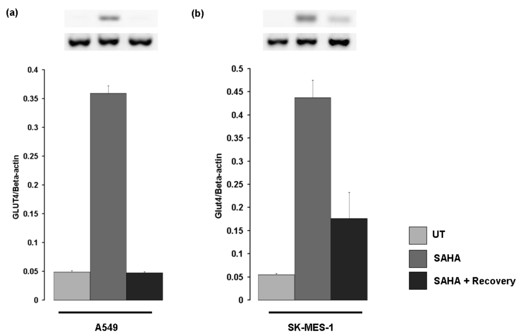 Our results have confirmed that Glucose transporters can be induced in NSCLC using epigenetic targeting. We have shown that both Glut-3 and Glut-4 can be induced in this fashion, and that such responses can be sustained following removal of drug. Our data suggests that this may be a unique way to metabolically target NSCLC which may have important clinical implications by allowing for more aggressive therapies to be considered. Furthermore, the ability to upregulate the insulin dependent glucose transporter Glut-4 may be of clinical benefit in the early detection of lung cancer as a combination of HDACi and inhaled insulin may enhance FDG-PET imaging.