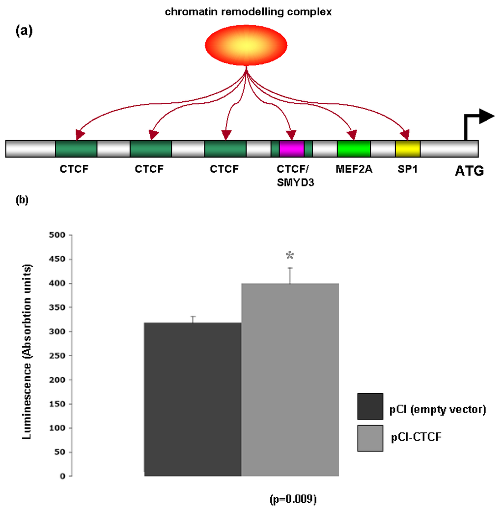 Bioinformatic analysis of the Glut-4 promoter revealed the presence of several consensus sites for proteins associated with chromatin remodeling including the lysine methyltransferase SMYD3A [OMIM: 608783], MEF2A [OMIM: 600660], Sp1 [OMIM: 189906] and CTCF [OMIM: 604167] (Figure 6a). To test whether Glut-4 may be regulated via CTCF, a luciferase construct fused to the Glut-4 promoter (pHGT4−2031/+61) was transfected into A549 cells in conjunction with either a CTCF overexpression vector (pCI-CTCF), or its corresponding empty vector (pCI), and luciferase activity measured 48 hours post transfection. The CTCF overexpression vector was found to enhance luciferase activity from the Glut-4 promoter (Figure 6b). CTCF is a highly conserved zinc finger protein that regulates gene transcription through the formation of higher order chromatin structures [23]. It has been postulated that CTCF may act as a transcription factor for context-dependent promoter activation/repression [23], and our results would seem to indicate that CTCF may be able to activate transcription of Glut-4. Support for this observation comes from a study of CTCF binding sites using high-resolution mapping of CTCF sites that identified a CTCF binding site within the Glut-4 promoter [24].