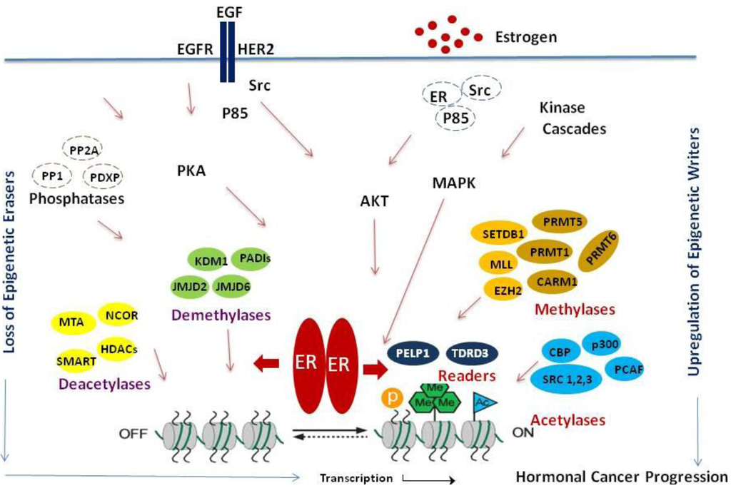 The steroid hormone estradiol plays an important role in the initiation and progression of breast cancer. The biological effects of estrogen are mediated by its binding to the structurally and functionally distinct estrogen receptors (ERα and ERβ) [1]. ERα is implicated as a key transcriptional regulator in breast cancer biology [2,3]. ERα functions as a ligand-dependent transcription factor that modulates gene transcription via direct recruitment to target gene chromatin. The transcription functions of ERα are shown to be influenced by several coactivators, including SRC1, SRC2, AIB1, PELP1, CBP, p300, PCAF, CARM1, PRMT1 and corepressors such as NCoR, SMRT and MTA1 [4-6]. ERα transcriptional outcome is regulated by a dynamic interaction of histone modifying enzymes, which are frequently associated with coregulators [7,8]. Evidence suggests that multiprotein complexes containing ERα, coactivators and histone modifying enzymes assemble in response to hormone binding leading to activation of transcription [9]. Estrogen stimulation induces several histone modifications at the ERα target gene promoters including acetylation, phosphorylation and methylation. The ‘histone-code hypothesis’ proposes combinatorial and/or sequential post-translational modification of histones, that is written by specific enzymes (‘writers’) and removed by others (‘erasers’) can be read by nuclear factors (‘readers’) to promote a variety of cellular processes by regulating gene expression [10]. The histone code hypothesis suggests that post-translational modifications confer specific functions and the modified histones recruit specialized proteins that facilitate defined functions [11]. The mechanism by which ERα targets and coordinates activities of kinases/phosphatases and histone modifying enzymes is poorly understood. Estrogen-ERα signaling has been traditionally implicated in the stimulation of transcription. Several acetylases/deacetylases and methylases/demethylases interact with ERα directly or indirectly and facilitate the necessary histone modifications. ERα's ability to modulate epigenetic changes by regulating writers, erasers and readers of epigenetic modifications and the reversible nature of these modifications provides a unique therapeutic opportunity to design novel drugs/small molecular inhibitors for treating hormonal cancers. In this review, we summarized the key evidence that links ERα to the regulation of histone modifying enzymes and readers of histone modifications and discuss the possibility of targeting these pathways for therapeutics.