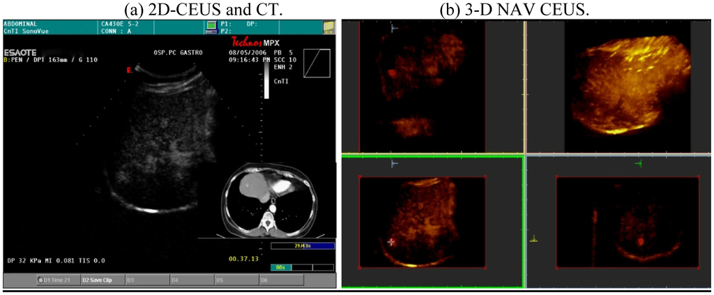- Ohto, M.; Kato, H.; Tsujii, H.; Maruyama, H.; Matsutani, S.; Yamagata, H. Vascular flow patterns of hepatic tumors in contrast-enhanced 3-dimensional fusion ultrasonography using plane shift and opacity control modes. J. Ultrasound Med. 2005, 24, 49–57. [Google Scholar]