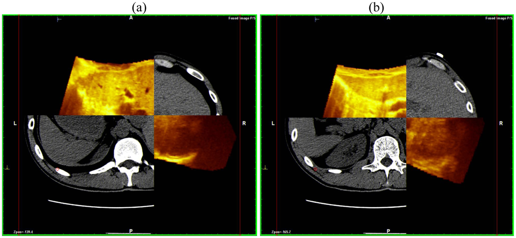 - Crocetti, L.; Lencioni, R.; Debeni, S.; See, T.C.; Pina, C.D.; Bartolozzi, C. Targeting liver lesions for radiofrequency ablation: An experimental feasibility study using a CT-US fusion imaging system. Invest. Radiol. 2008, 43, 33–39. [Google Scholar]