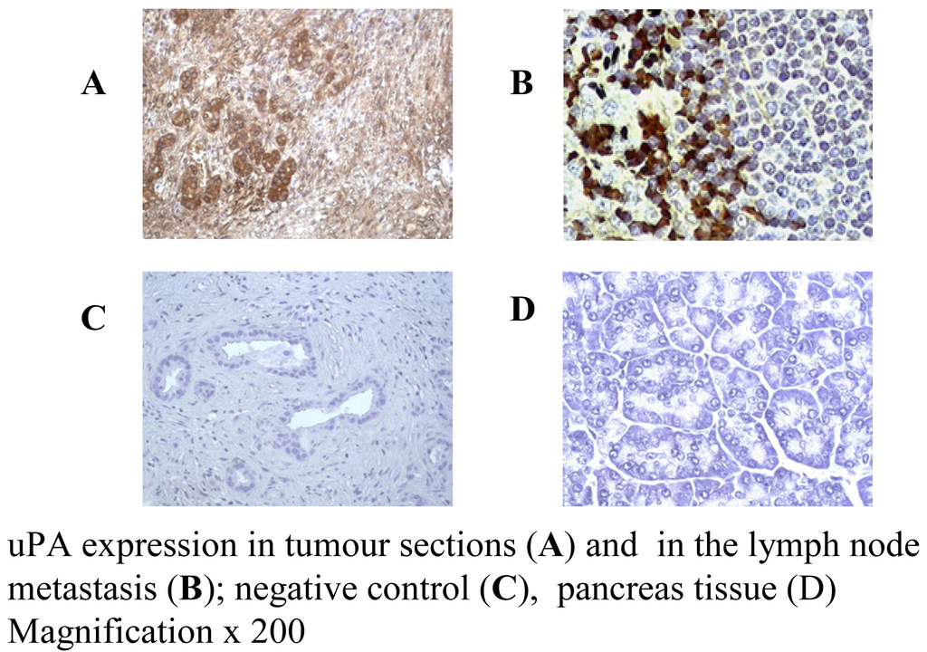 These observations suggest that significant over expression of uPA correlates closely with the rapid progression and invasiveness of pancreatic cancer and that uPA may provide a therapeutic target for pancreatic cancer treatment.