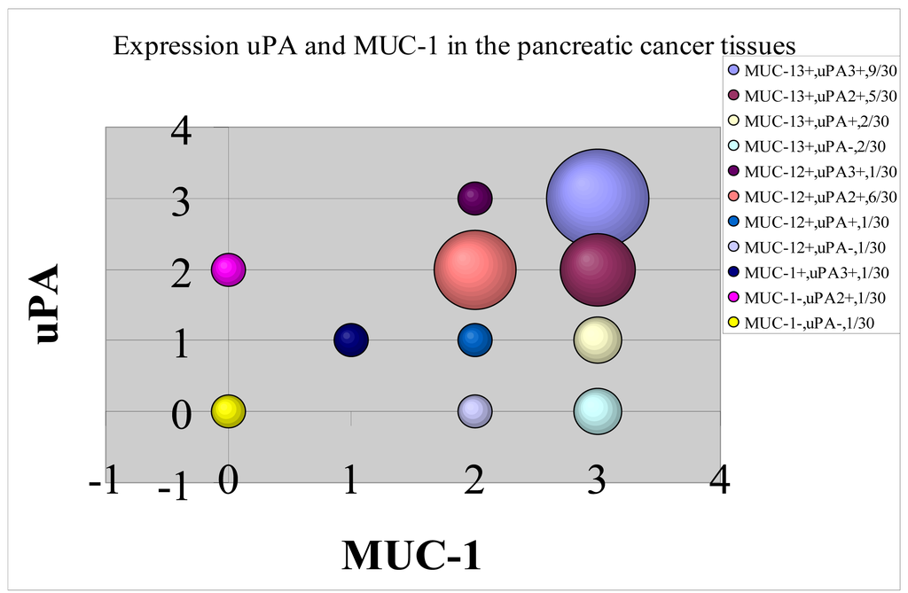 The above results show that both MUC1 and uPA are strongly expressed in the three pancreatic cancer cell lines and in most pancreatic tumors from patients. While these receptors are completely different in nature, the question is whether their expression is analogous or correlated, or complementary and uncorrelated. The answer is given in Figure 3 where a high degree of correlation is observed. The size of the circle represents the number of events. While there are some results for which uPA and MUC1 are highly uncorrelated (zero vs. 2+), the great majority of events show a high correlation in expression in the 2+ and 3+ data.