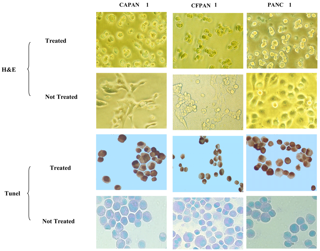 Typical morphologic changes and a high percentage of TUNEL-positive cells in three pancreatic cancer cell lines were observed after treatment using 213Bi-C595 in vitro.