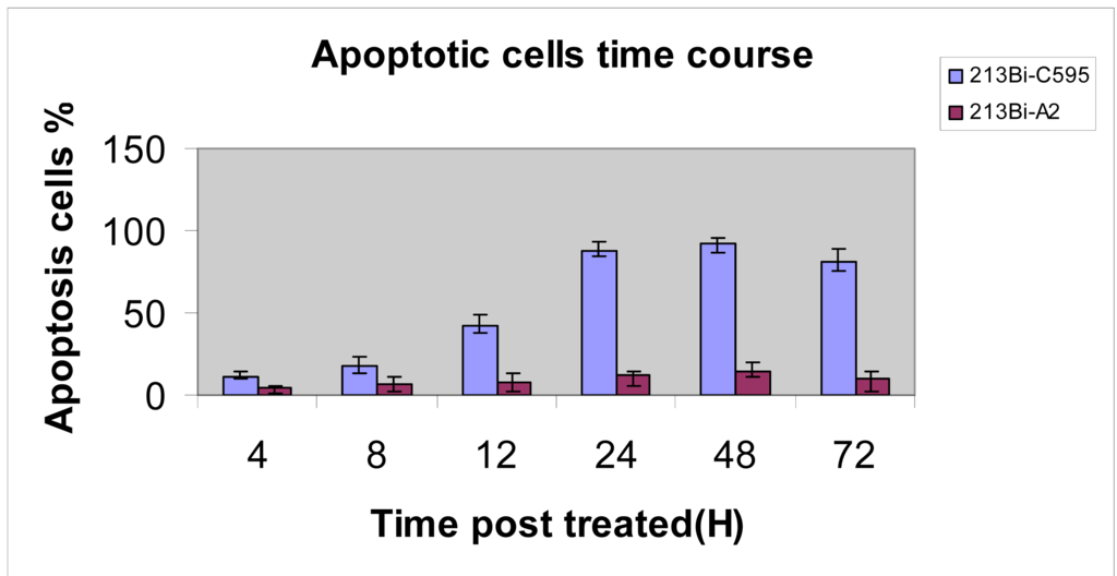 A representative experiment is shown in Figure 4. Incubation of pancreatic cancer cells in C595-cDTPA-213Bi (A) causes morphological changes of treated cancer cells and induces apoptosis. The percentages of apoptotic cells are 73 ± 3 (CAPAN-1), 78 ± 2 (PANC-1) and 81 ± 3% (CFPAC-1) at 48 h after treatment with 370 kBq/104 cells. However, the percentage of apoptotic cells for nonspecific control groups (B) is much lower (12 ± 3%) and apoptosis was not observed for medium only cells (C). Thus the major cause of cell death is apoptosis.