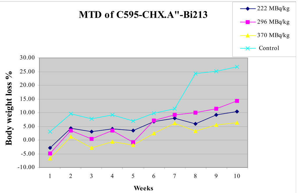 The maximum tolerance dose for 213Bi-C595 for weight loss was found to exceed 370 MBq/kg. The maximum short-term body weight loss is 8% at ∼ one week in the high dose group (370 MBq/kg). Growth rates for treated mice were independent of injected activity and were similar to controls from 2 to 7 weeks after which the treated mice showed reduced growth rates.