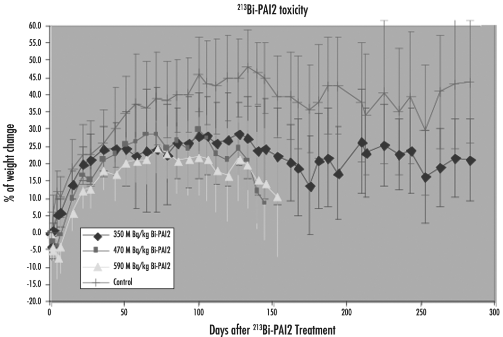 Change in mouse bodyweight with time is shown in Figure 6 for IP injections of 222, 296 and 370 MBq/kg of AIC, using the CHX-A″ chelator. Test mice suffered a small, short-term weight loss before embarking on a growth rate similar to that for the controls over ten weeks.