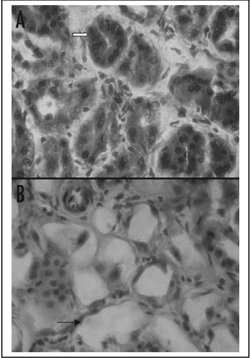 Evidence of severe and widespread renal tubular necrosis was found in rabbit studies (Song 2007). Figure 8 compares normal renal structure with radiation necrosis caused by 350 MBq/kg of 213Bi-PAI2 at 13 weeks post-injection. The alpha radiation causes tubular vacuolization and dilation.