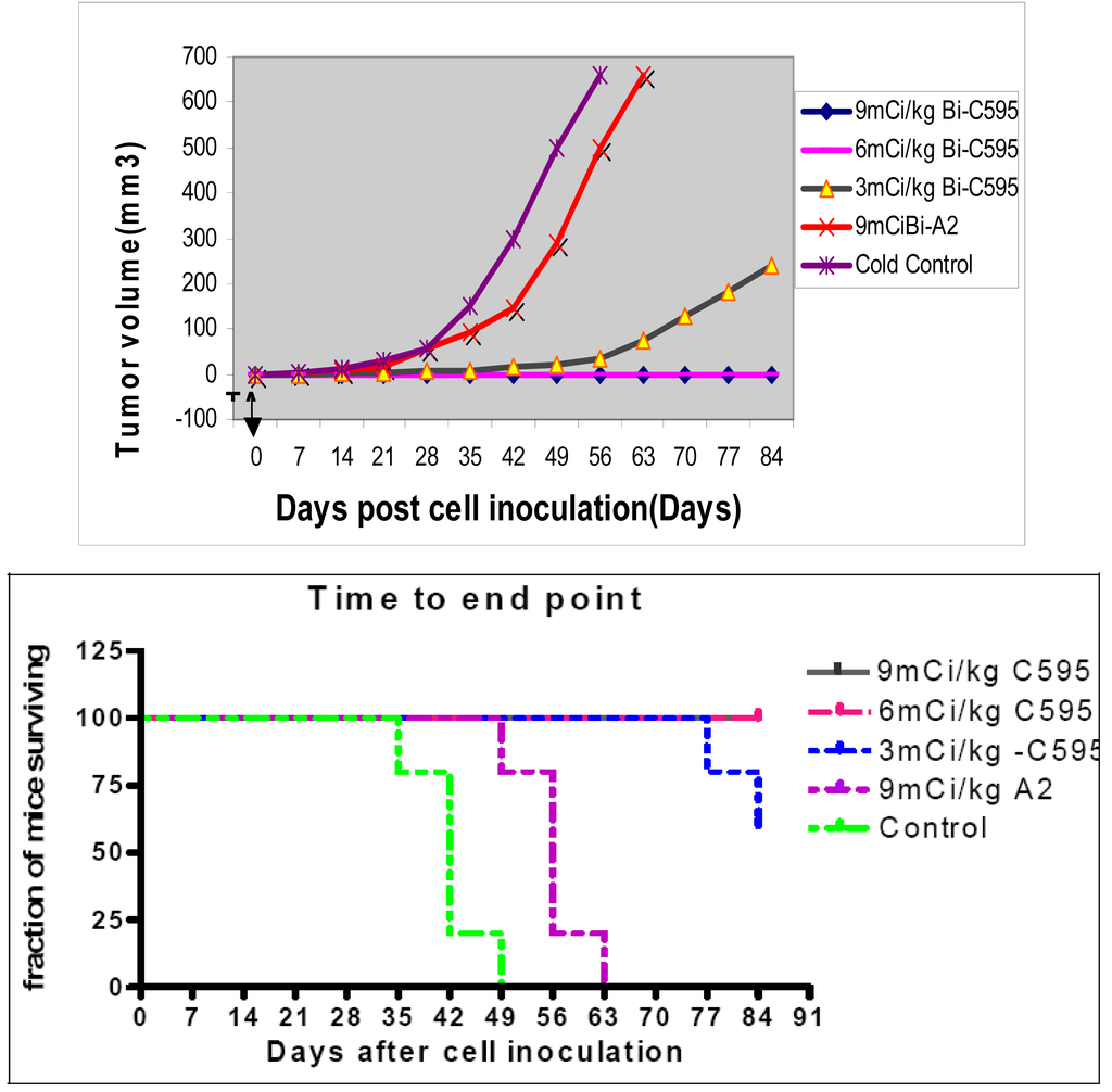 Tumor volume reached 15 mm3 at 22 days for one out of five mice in the 1.85 MBq group, compared with an average of 13 days for all mice in non-specific 213Bi-A2 group and eight days for all mice in the cold C595 control.
