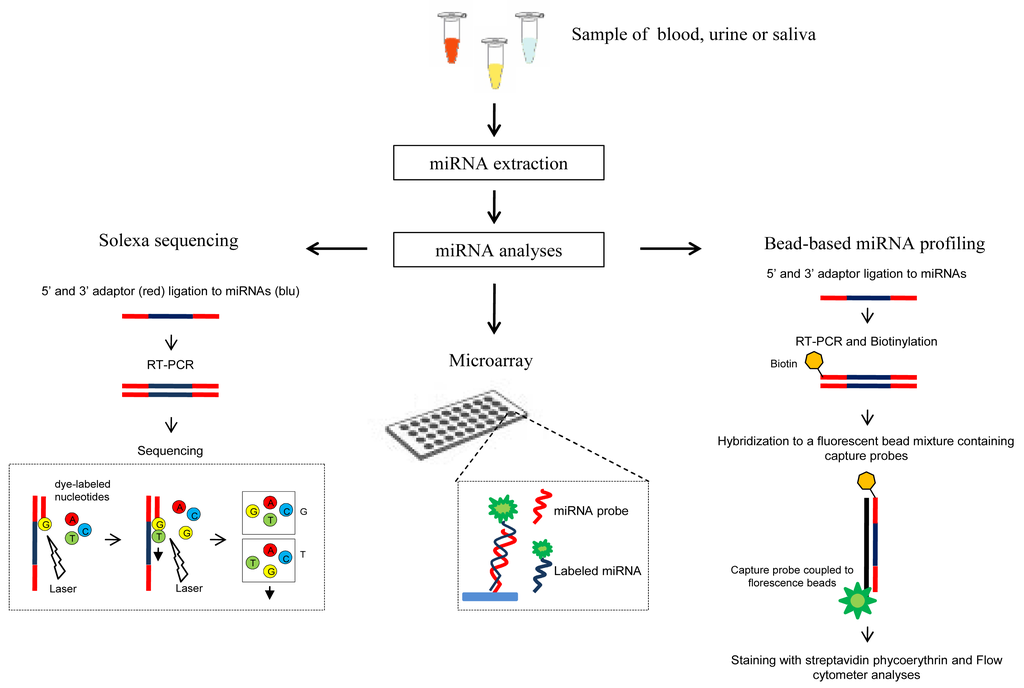 Recently, circulating miRNAs are emerging as very promising biomarkers for cancer [29,30], since they are abundant, tissue specific and relatively stable. Thus, several methods have been recently proposed to detect miRNAs in serum, plasma, urine and other human body fluids (Figure 2). Noteworthy the use of body fluids as biological materials for miRNA assays has the main advantage to be noninvasive or minimally invasive approaches.