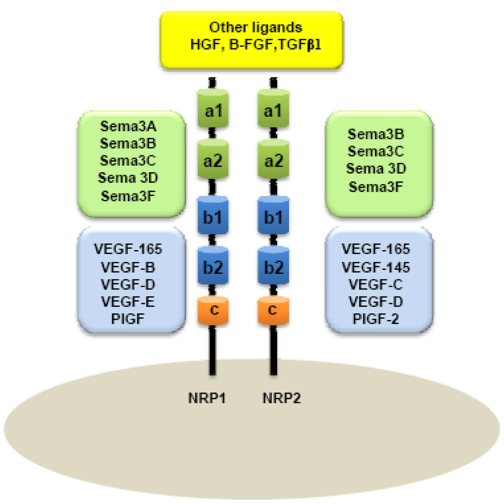 In humans, NRP1 and NRP2 genes map to two different chromosomes: Chromosomes 10p12 and 2q34, respectively [25]. Although NRPs share only 44% homology in their amino acid sequences, some similarities to known proteins can be observed in their structure. NRPs are composed of an extracellular domain, transmembrane domain and a short intracellular domain. Indeed, the extracellular domain is composed of two Complement Binding motifs (CUB), homologous to the C1r and C1s complement components (named domains a1 and a2), two domains b1 and b2 homologous to the coagulation factors V and VIII and one third domain, c, homologous to the meprim domain sharing a tyrosine phosphatase activity μ [4,26]. a1/a2 domains are responsible for semaphorin binding, whereas b1/b2 are suggested for both VEGF and semaphorin binding. c-domain is involved in dimerization of the receptor [8] (Figure 1). Because NRPs have a short intracellular domain of only 40 amino acids, it was assumed that they cannot transmit any signal on their own.