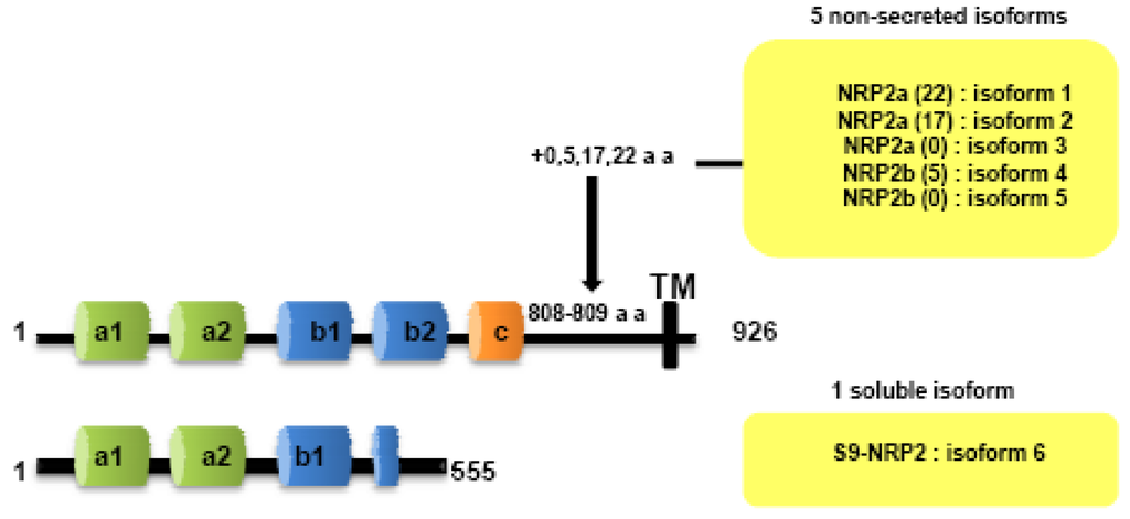 Two soluble forms of NRP1 (s11NRP1 and s12NRP1) and one of NRP2 (s9NRP2) were cloned by Rossignol and collaborators [25]. Later, two novel soluble forms of NRP1, sIIINRP1 and sIVNRPI were characterized [27]. While these soluble isoforms have conserved their extracellular domains responsible for ligand binding, c-domain, transmembrane and intracellular domains were lacking. Moreover, Gagnon et al., reported that s11NRP1 is capable of tumor cell apoptosis by antagonizing VEGF binding, suggesting that sNRPs and NRPs have opposite functions [28].