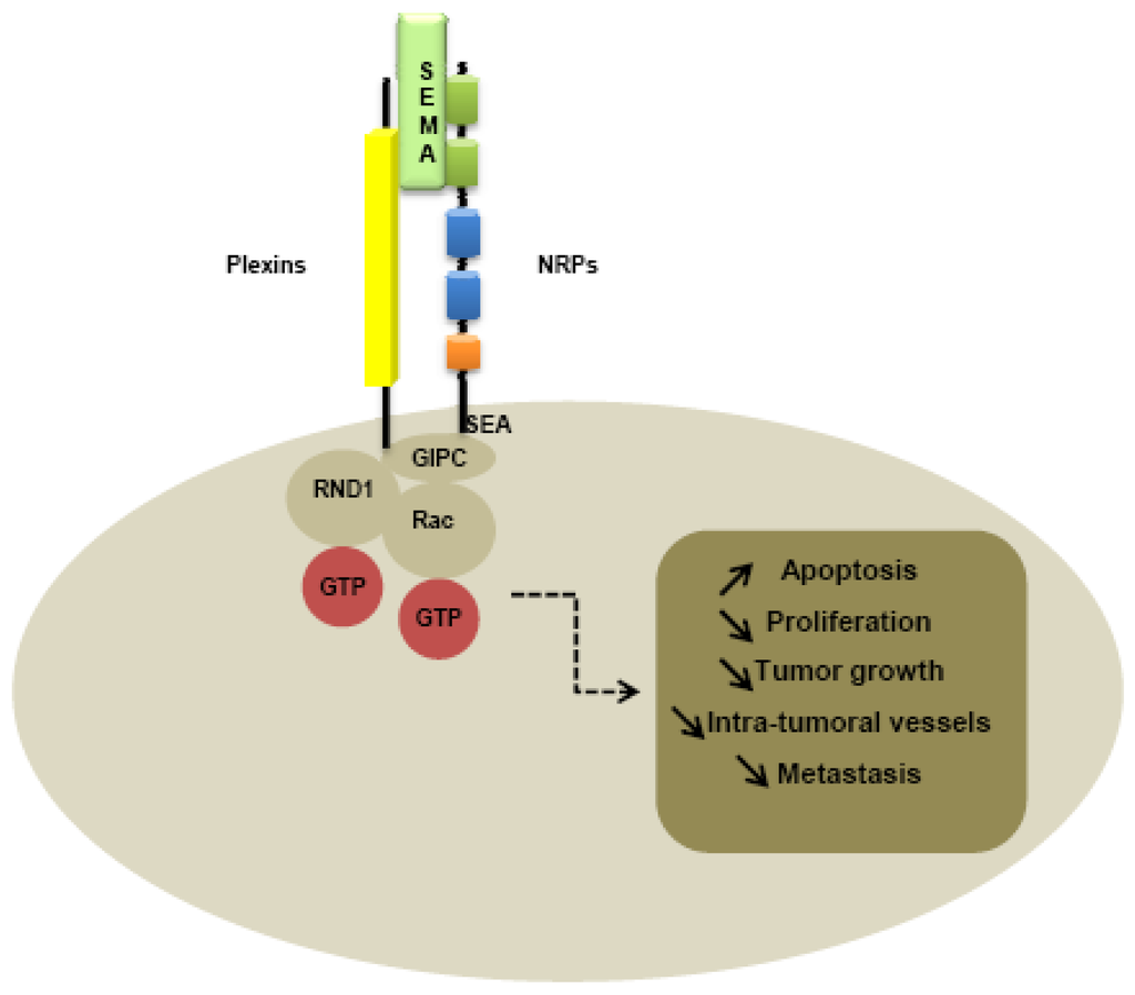 NRPs role in tumorigenesis is more complex than initially thought and appears to depend on the nature of the ligand. In the context of cancer, it appears that semaphorins and VEGF are competing for NRPs binding, although they bind different NRPs sub-units. While semaphorins are responsible for inhibition of tumor growth, proliferation and even induction of apoptosis in cancer cells, VEGF tends to oppositely enhance angiogenesis and tumor growth. As described above, some semaphorins such as Sema3B and Sema3F are considered as TSG and are very often downregulated in cancer cells [102,104,120]. Overexpression of Sema3 genes may represent a promising new type of therapy for preventing tumor angiogenesis, growth, and metastasis. Moreover, other semaphorins such as Sema3E or Sema4D function as pro-angiogenic and pro-oncogenic molecules [89,126,159,160]. Neutralization of these molecules or their relative receptors thus may represent a new therapeutic strategy for cancer treatment. In particular, one monoclonal antibody VX15/2503 binding to the sema4D is currently in phase-1 of development for the treatment of advanced solid tumors [161]. Therapeutic use of semaphorin pathway seems to represent one of the major therapeutic strategies considered, capable of antagonizing VEGF-mediated angiogenesis and tumor progression [88].