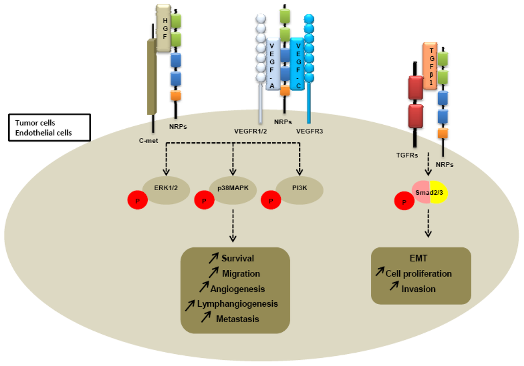 NRPs are multifunctional non-tyrosine kinase receptors for class-3 semaphorins and VEGF family members implicated in both physiological development and pathological situations. NRPs are expressed in endothelial cells and in many types of cancer cells. Through their direct interactions with plexins or growth factor receptors, NRPs have rapidly emerged as key regulators of angiogenesis, lymphangiogenesis, EMT and tumor progression. In many cancers, expression of one or both has been correlated with tumor progression and/or poor prognosis. As a consequence, several strategies have been used in pre-clinical studies to inhibit NRPs function, such as knockdown strategies with siRNAs, small peptide inhibitors, and blocking antibodies. However, the molecular mechanisms by which NRPs modulate cancer progression are still poorly understood. Understanding the interactions between VEGF, VEGFRs, semaphorins and NRPs should provide additional data for the rational development of novel anti-tumor strategies.