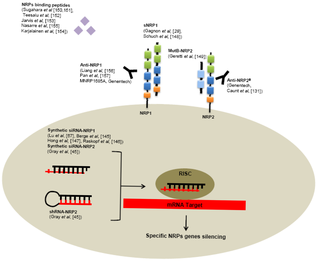 Several tools have been developed to neutralize NRPs receptors, targeting NRPs genes like RNA interference or receptors using specific monoclonal antibodies or small peptides (Figure 5).