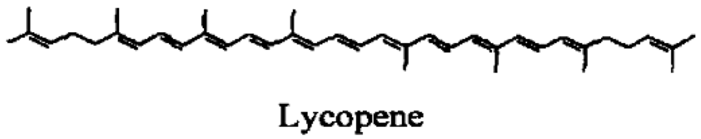 Among the different carotenoids, one of the ongoing research candidates for the prevention of lung cancer risk is lycopene. Lycopene, one of more than 600 carotenoids synthesized by plants and photosynthetic microorganism [10], is a tetraterpene hydrocarbon containing 40 carbon atoms and 56 hydrogen atoms. Lycopene is the most abundant carotenoid in tomatoes (Lycopersicon esculentum L.) with concentrations ranging from 0.9–4.2 mg/100 g depending upon the variety [11]. Tomato sauce and ketchup are concentrated sources of lycopene compared to unprocessed tomatoes [12]. Other edible sources of lycopene include rosehips [13], watermelon, papaya, pink grapefruit, and guava [14]. Belonging to the hydrocarbon carotene class of carotenoids, lycopene is acyclic and contains 11 conjugated and two non-conjugated double bonds (Figure 1). Because it is acyclic and lacks a bionone ring, lycopene has no pro-vitamin A activity. Although dietary lycopene is predominantly all-trans, more than 50% of the lycopene present in human serum and tissues is in cis-forms [15]. Lycopene absorption from dietary sources is influenced by several factors, such as the break up of the food matrix containing lycopene, cooking temperatures and the presence of lipids and other lipid soluble compounds including other carotenoids [16]. Absorption of lycopene is similar to that of other lipid soluble compounds and is absorbed across the gastrointestinal tract via a chylomicron mediated mechanism. Incorporated into chylomicrons, lycopene and other carotenoids are transported from the intestinal mucosa to the general circulation via the lymphatic system. In the blood, carotenoids are transported by lipoproteins. In particular, LDL is the primary carrier of lycopene. In general, 10–30% of the dietary lycopene is absorbed by humans. It is absorbed equally efficiently from different sources of lycopene including tomato sauce, tomato juice and tomato oleoresin capsules [17]. Liver, seminal vesicles and prostate tissue are the primary sites of lycopene accumulation in vivo [18]. Furthermore, Liu et al. [19] found that lycopene can be selectively localized to the nuclear membrane and nuclear matrix, suggesting a possible role for a lycopene receptor or transporter. Lycopene in the tissues undergoes oxidation and metabolism. Several oxidized form of lycopene and polar metabolites have been isolated and identified [20]. Apo-6′and apo-8′-lycopenals were reported to be present in raw tomatoes [21]. Some lycopene metabolites, including 5,6-dihydroxy-5,6-dihydro-lycopene [22], and apo-6′-, apo-8′-, apo-10′-, apo-12′- and apo-14′-lycopenals have been also detected in human plasma.