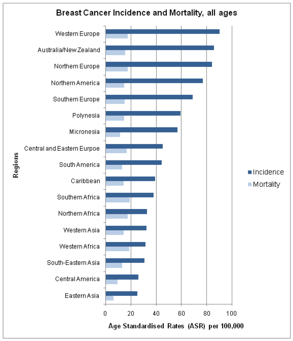 The estimated global age standardised incidence and mortality rates of breast cancer in 2008 are presented in Figure 2. Despite having a lower incidence of breast cancer, we find a higher mortality to incidence ratio amongst developing nations (Figure 2).