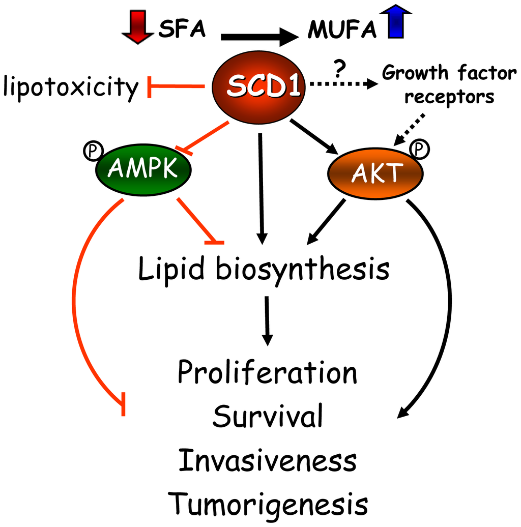Based on this increasing collection of cell-based and animal tumor studies, as well as in epidemiological observations in cancer patients, SCD1 has emerged as a critical factor in the mechanisms of cancer onset and progression. These studies have revealed the central role of the desaturase in a series of interconnected metabolic and signaling pathways that support the biochemical and biological phenotype of cancer cells (Figure 1). SCD1 appears to modulate multiple pathways and cascades in cancer cells, including fatty acid biosynthesis through the regulation of ACC, either by allosteric and/or AMPK-mediated mechanisms; glycerolipid formation, likely through the enhanced production of MUFA substrates to the acyltransferases; and the Akt signaling pathway, potentially by affecting the activation status of signaling proteins belonging to this pathway. Whether the regulation of signaling events precedes the changes in global lipogenesis induced by the desaturase has yet to be determined. Additionally, evidence obtained from lipotoxicity cell models highlights another not less fundamental role of SCD1 activity in cancer cells: its ability to suppress a potentially toxic accumulation of SFA by its simple conversion into MUFA, averting cell stress response and subsequent apoptosis.