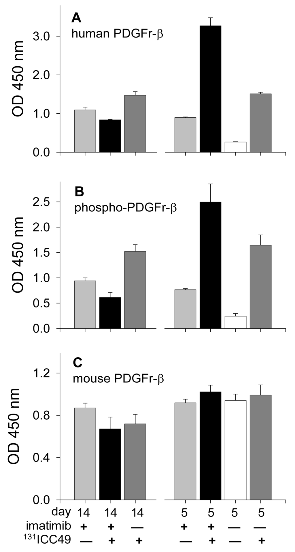 ELISA analyses offer compelling evidence that levels of PDGFr-β strongly depend on the treatment employed, time elapsed after this treatment, and the source of the receptor, i.e., whether of the human origin derived from tumor cells or of the mouse origin derived from mesenchymal cells of the host (Figure 1). Tumors extirpated from the control mice that received sham IP injections of PBS showed only low levels of human PDGFr-β (Figure 1A) and correspondingly low levels of phosphorylated PDGFr-β (Figure 1B). The magnitude of mouse PDGFr-β expression was nearly identical in all tumor samples recovered five days after the treatment irrespective of what this treatment was (Figure 1C). On the other hand, levels of human PDGFr-β expression greatly depended on the treatment. In tumors recovered five days after treatment, human PDGFr-β levels were 3.4×, 12.4×, and 5.7× higher in the imatinib-treated (light gray bar), 131ICC49 + imatinib-treated (black bar), and 131ICC49-treated mice (dark gray bar), respectively, as compared to PBS-treated control mice (white bar). The receptor phosphorylation followed along the same lines with the treated tumors showing on average 3.1×, 10.3×, and 6.6× higher levels of phosphorylation than tumors from PBS-treated mice demonstrating that the primary response of the tumor tissue to the insult by imatinib or by radiation from 131ICC49 is the increased phosphorylation of the human PDGFr-β receptor. PDGFr-β associated with the stroma, i.e., receptors of the mouse origin, do not seem to respond to any of applied treatments in a major way. No significant deviations in levels of mouse PDGFr-β in treated tumors as compared to those measured in tumors from control mice were detected (Figure 1C).