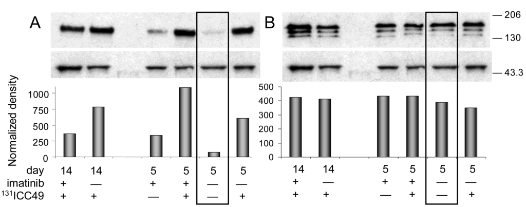 Mice were treated with imatinib and 131ICC49 as described previously []. Briefly, a lottery was conducted to separate mice into four groups as follows: group 1: control mice receiving i.p. injections of PBS (b.i.d.) on days −2, −1, and 0; group 2: imatinib group, mice receiving imatinib as the i.p. doses of 100 mg/kg/day in PBS (b.i.d.) on days −2, −1, and 0; group 3: 131ICC49 group, mice receiving i.p. injections of PBS (b.i.d.) on days −2, −1, and 0; and group 4: 131ICC49 plus imatinib group, mice receiving imatinib as the i.p. doses of 100 mg/kg/day in PBS (b.i.d.) on days −2, −1, and 0. On day 0, mice in groups 3 and 4 received via a tail vein i.v. doses of 131ICC49 2 h after the last dose of imatinib. Sections of tumors harvested during necropsy were frozen in liquid N2, and stored at −80 °C until ready for ELISA and Western blotting analyses.