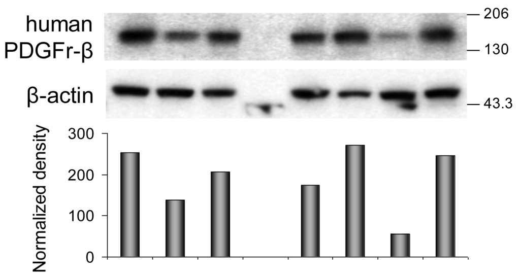 The assay was purchased from Cell Signaling Technology, Inc. (Danvers, MA, USA). All procedures were conducted according to the vendor's instructions for the detection of endogenous levels of phospho-PDGFr-β (Tyr751). To quantify the total PDGFr-β and human PDGFr-β, the general principle of the assay was applied with the appropriate modification in the selection of the primary and secondary antibodies. The capture antibody coated onto all wells and provided by the manufacturer was rabbit mAb 28E1, which binds non-phosphorylated and phosphorylated PDGFr-β proteins of human and mouse origin. Primary antibodies were as follows: mouse mAb 3166 anti-phospho-PDGFr-β (Tyr751) for detection of the total phospho-PDGFr-β; mouse mAb (ab 10847) anti-human PDGFr-β for detection of human PDGFr-β (Abcam, Cambridge, MA, USA); and rat mAb (clone APB5) anti-mouse PDGFr-β for detection of the murine PDGFr-β (eBioscience, San Diego, CA, USA). Horseradish peroxidase-linked (HRP) anti-mouse antibody (7076) provided with the assay was used as a secondary antibody for phospho-PDGFr-β and human PDGFr-β detection. Donkey HRP-linked anti-rat polyclonal Ab (R&D Systems, Inc. Minneapolis, MN, USA) was used to detect murine PDGFr-β. Stabilized tetramethylbenzidine (TMB) was used as a substrate to produce color. The absorbance was read at λ = 450 nm within 30 min after the addition of the “stop” solution provided with the kit.