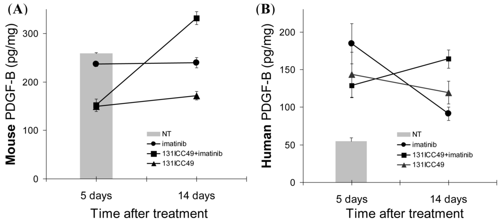 Immunohistochemical analyses of human pancreatic cancer biopsies and xenografts extirpated from mice show expression of PDGFr-β and PDGF-B mainly on cells of the tumor stroma. Treatment with imatinib inhibits PDGFr-β phosphorylation but reportedly, the overall expression of this receptor is not altered [,,]. In contrast, our results show remarkable treatment-and time-dependent variations in the expression of cancer cell-associated PDGFr-β and its cognate ligand PDGF-B. These changes were corroborated by two techniques, ELISA and immunoblotting. The majority of the phosphorylated receptor derives from the human cancer cells. What accounts for this remarkable response of the tumor cell must be further investigated. Meanwhile, we hypothesize that the initial injury of the tumor stroma by PDGFr-β inhibition with imatinib or by irradiation with 131ICC49 triggers an immediate and massive feedback from tumor cells. The response seems to be autocrine and paracrine. Tumor levels of human PDGF-B increase twofold in response to all single and multimodality treatments after five days compared to tumors from PBS-treated controls. Tumors analyzed 14 days after treatment also show much increased production of human PDGF-B. By comparison, these changes are accompanied by a substantial suppression in the production of mouse PDGF-B in all but 131ICC49 + imatinib tumors collected on day 14 after treatment. Is this indicative of the tumor cell response to the damaged stroma? Possibly. A change in the expression of some growth factors is often associated with the analogous change in the expression of the cognate receptors.