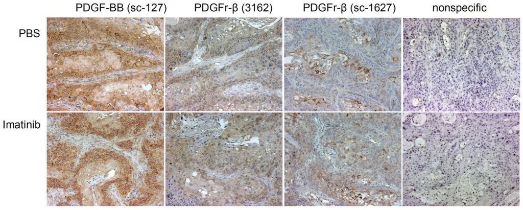Previous studies implicated the autocrine loop caused by the high expression of PDGF-B and PDGFr-β in the proliferation of some glioblastomas [,]. Here, we demonstrate that in untreated human pancreatic cancer cells PDGFr-β/PDGF-B signaling mechanism appears to be dormant in the absence of the stromal injury. The basal levels of human PDGFr-β and human PDGF-B are low. The primary target for imatinib is the stromal receptor. Likewise, 131ICC49 first targets the extracellular antigen TAG-72. Many tumors show diffuse cytoplasmic TAG-72 but there are no reports from the in vivo studies on the intracellular localization of B72.3 or CC49, two antibodies most often used to target this antigen [-].