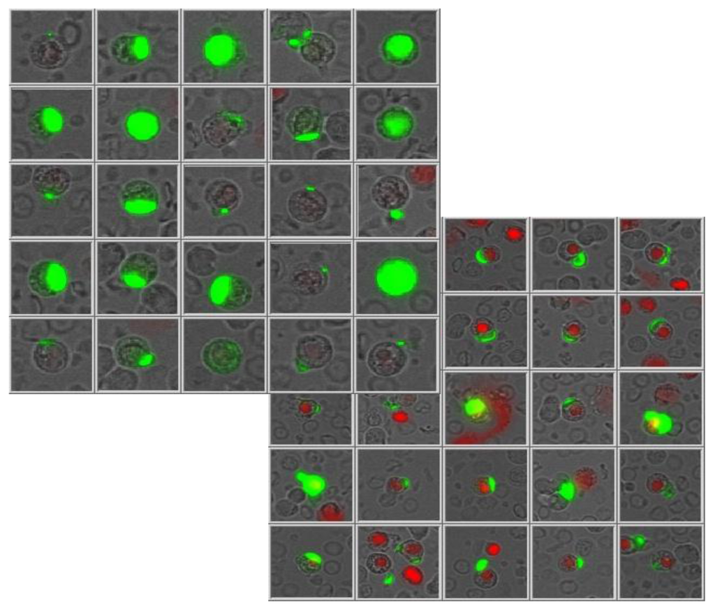 A defined volume of the cell suspension was applied to a defined area either on adhesion slides (Menzel Gläser, Braunschweig, Germany) or into wells of Elisa plates; the adherent cells were measured either using a Laser Scanning Cytometer (LSC® Compucyte Corporation, Cambridge, MA, USA) and collecting the FITC-HEA and the PE-CD45 fluorescence using a photomultiplier (PMT) or using image analysis in the ScanR (Olympus, Munich, Germany). Values are displayed in scatter grams and histograms. Both approaches enable the user to locate cells contained within the positive population for visual examination and to take photos and fluoromicrographs. Figure 1, viability of the cells was visually detected and verified by Propidium Iodide (PI) staining (entering exclusively dying cells), looking for nuclear PI stain and exclusive surface EpCAM staining. Patients were followed for their CETC numbers from surgery to adjuvant chemotherapy, during adjuvant treatment, and some of them during the subsequent maintenance therapy. CETCs were analyzed at each visit, if possible at intervals of three months and later at more extended intervals. This allowed longitudinal follow-up of the CETCs. Patients were categorized according to their behavior into those with any increase, decrease or no change from surgery to the onset of chemotherapy, during chemotherapy and in some cases over a period of three years or if relapse occurred before this time. Statistical analyses were performed using the SPSS program, version 16.1.