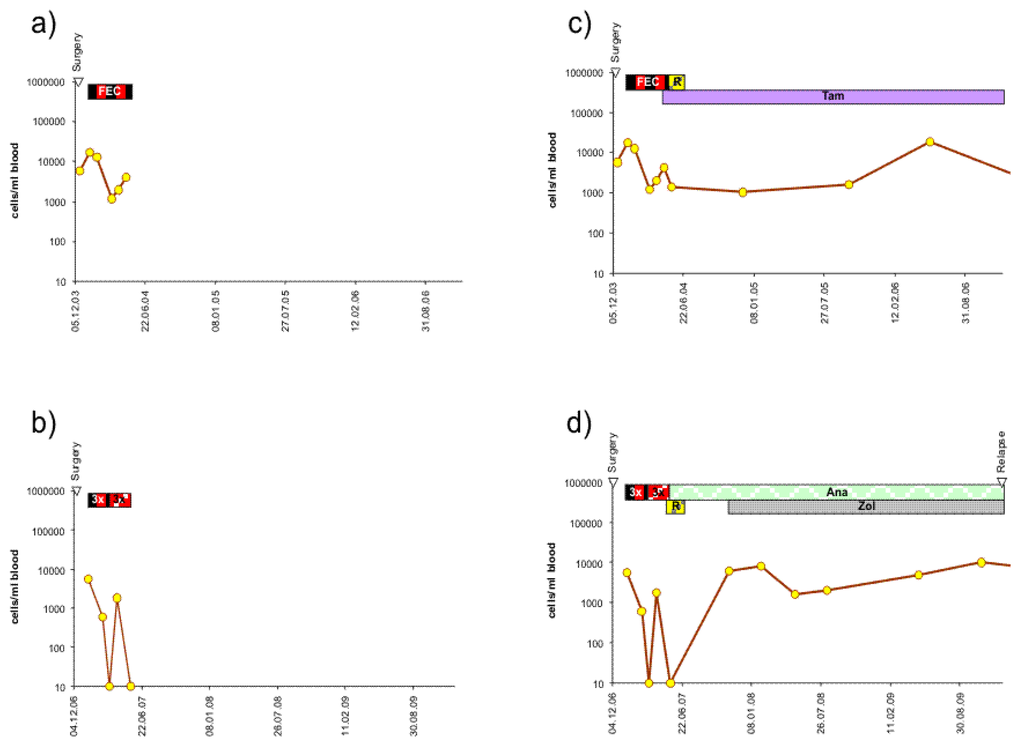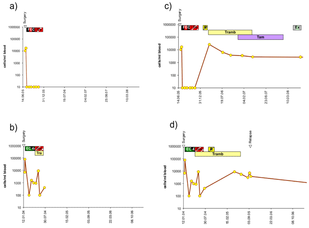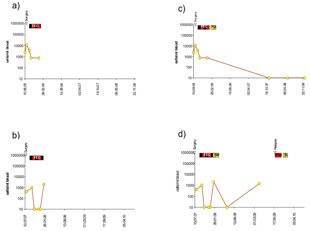 Most patients, nowadays, are treated with adjuvant therapy subsequent to surgery. Although CETC were effectively reduced by adjuvant therapy, in patients with early relapses, rapid re-increases occurred even during chemotherapy (Figures 2b, 3b and 4b). We can, to a certain extent, try to calculate the influence of chemotherapy.