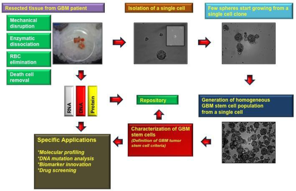 GBM stem-like cells are likely responsible for not only the initiation of GBM but also subsequent recurrences [1-4]. Although isolated populations of GBM tumor spheres is the ideal population for in vitro modeling, successful establishment, maintenance, and experimentation on tumor sphere cultures from primary tissue has previously been difficult to perform [2,16,17] In this review, TSCs isolation from human patients with GBM and culture in a specialized stem cell media to promote selective formation of tumor spheres is described.