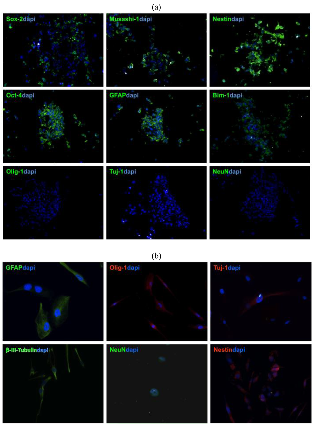 To verify that stem cells generated from GBM patient-derived tissue express neural stem cell (NSC) markers, tumor spheres need to be cryosectioned and stained with NSC antibodies [11,13,16]. Patient-derived GBM stem cells show usually strong expression of GFAP, Nestin, Sox-2, Musashi-1, Bmi-1 (Figure 3a), whereas no immuno-reactivity is observed with differentiated cell markers, such as Tuj1, NeuN, which are early and late neuronal markers, respectively, or Olig-1, which is specific for oligodendritic lineages (Figure 3b) [12,13].