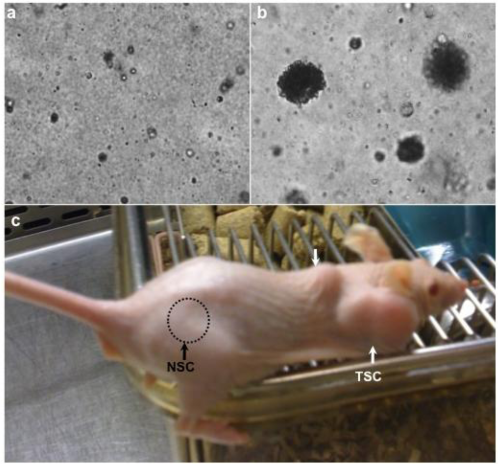 A method to determine whether patient driven TSCs adopt the invasive characteristic of cancer cells, GBM stem cells can be seeded along with normal human NSCs as negative control in soft agar. Normal neurospheres did not grow in soft agar until the third week but began forming colonies toward the end of fourth week. Usually, neural stem cells form small and few colonies anywhere between 4 and 7 weeks after they are implanted into soft agar whereas GBM stem cells start colony formation during the first week [8].