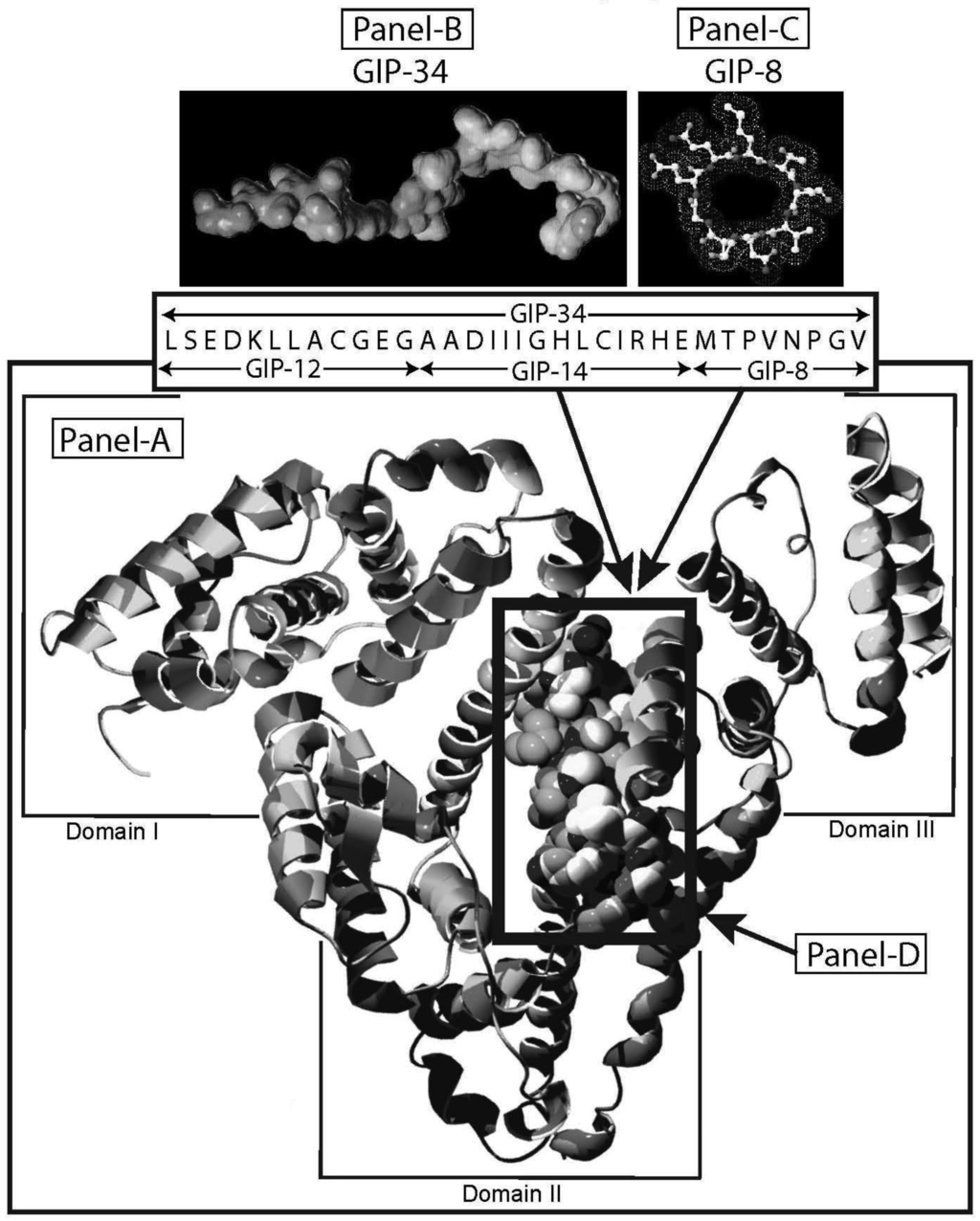 The GIP-34 and its peptide synthetic fragments were designed and derived from a naturally-occurring fetal protein (AFP) present during human pregnancy. The encrypted GIP segment lies buried within the protein molecule until AFP encounters stress/shock environments; GIP is then exposed in the conformationally transformed fetal protein (Figure 1). The GIP segment functions to prevent and suppress inappropriate fetal growth until proper signaling transduction cascades can be re-established in the developing embryo/fetus. Such GIP surveillance might account for the low prevalence of embryonic/fetal defects and tumors during pregnancy. Due to the low nanogram levels (6 ng/mL) present in circulating adult HAFP, transformed AFP and its exposed GIP segments are not available to adult humans to aid in bodily defense from cancer and benign growths. Thus, the initial goal of the GIP technology platform was to eventually make GIP-34 and its growth inhibitory subcomponents available as peptide drugs for adults afflicted with benign hyperplasia and cancer growth as seen in hepatic, reproductive, and gastrointestinal tumors. Currently, GIP and its derived segments are under development for conjugation to chemotherapeutic drugs by means of covalent bonding to side chain residues. Preliminary in vitro studies using GIP-8 have already shown success in the conjugation of GIP to doxorubicin and GIP-34 has been chemically linked to radioiodine and technicium-99 for in vivo use in clinical imaging of mammary tumors [45]. Since GIP-34 binds iron and other heavy metals (copper, zinc, cobalt), it has been utilized in preliminary studies in clinical imaging procedures (MRI, CAT, etc.). Because GIP binds to Congo Red and anilinonapthalene-sulfonic acid (ANS), it could be considered as an agent for organ function tests [18]. Finally, the development of GIP-34 as a DNA-PK inhibitor peptidomimetic is in its beginning stages.
