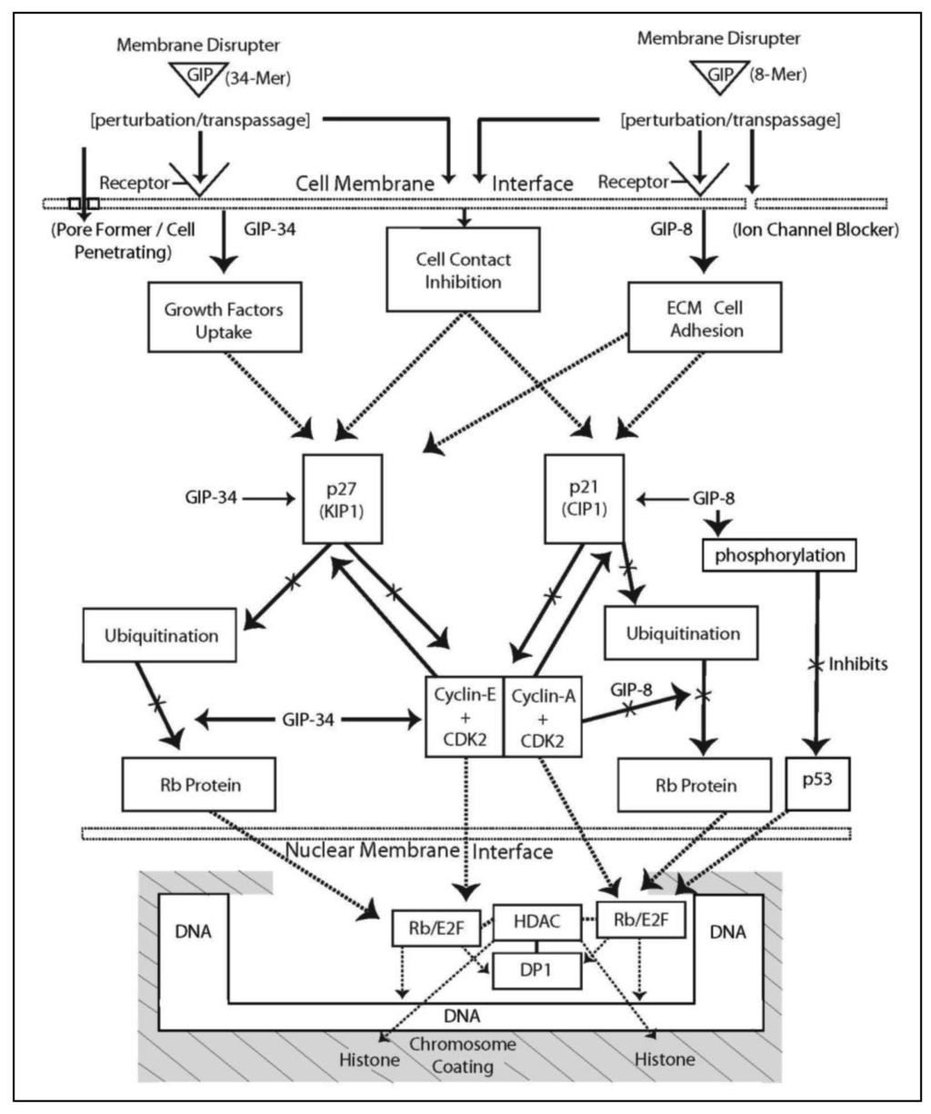The mechanism of action of GIP-34 being proposed is based on experimental data accumulated from multiple laboratories over the last 17 years (Table 1). The data was obtained from in vitro cell culture, in vivo xenografts and isografts, RNA microarray analysis, and electrophysiologic studies. A flow diagram is presented in Figure 3 which proposes the sequential events at the time of GIP-34/GIP-8 contact with the cancer cell surface, followed by a cascade of signal transduced steps within the cytosol, resulting in the blockage of transnuclear passage of transcriptional or effector agents (not GIPs) into the nucleus.