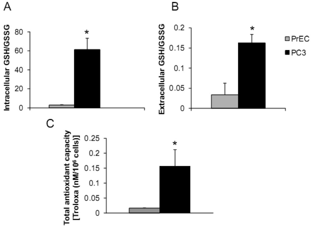 PC3 cells demonstrated significantly greater levels of intra- and extracellular GSH/GSSG ratios and total intracellular AC when compared to PrEC cells. Powolny and Singh assessed gene expression by real-time PCR using human oxidative stress and antioxidant defense RT2 profiler and demonstrated up-regulation of several gene expression levels in PC3 cells in comparison to PrEC cells including GPx4, Prx1, Prx2, Prx6, CuZnSOD, MnSOD, TR1, and TR2 [26]. Additionally, levels of glutathione-related gene expression were down-regulated in PC3 cells including GPx6 and 7 [26]. Differences of intra- and extracellular redox states of prostate cancer cells may correlate with cancer phenotypics properties, including dysregulated cell growth and increased cell invasion.