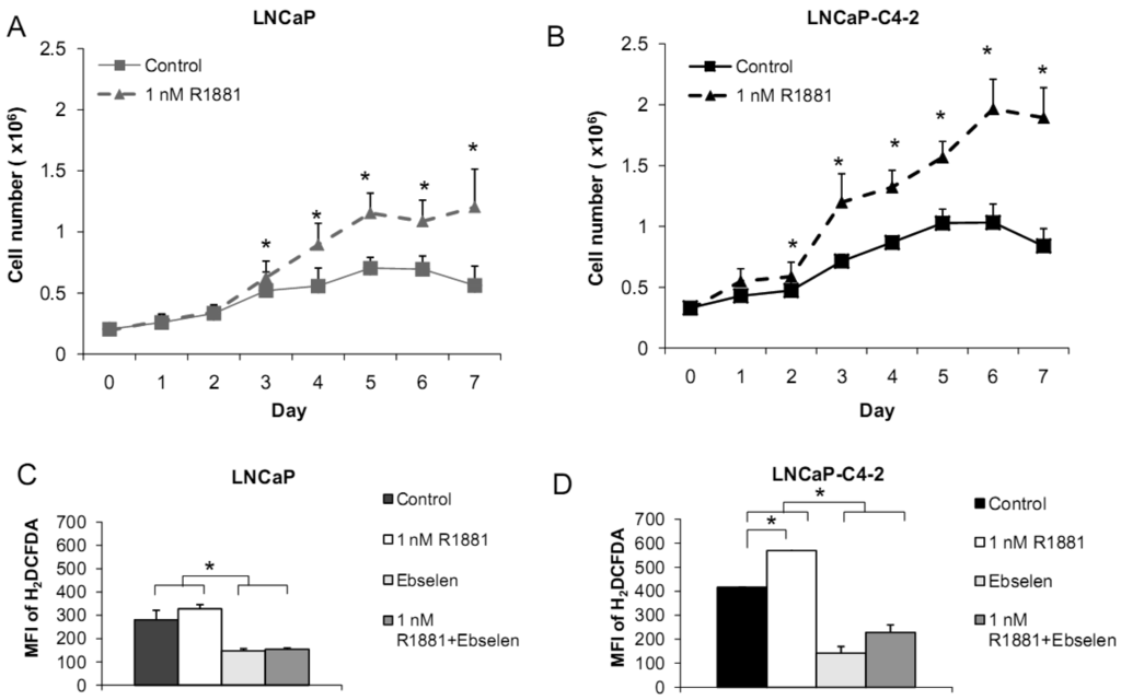 Based on the demonstrated unique redox properties of LNCaP and LNCaP-C4-2 cells and their responsiveness to androgen, we studied the effects of R1881 (Methyltrienolone, a synthetic androgen) on cell growth. Cells were treated with 1 nM of R1881 for seven days. As shown in Figures 10A,B, R1881 treatment significantly stimulated growth of both LNCaP and LNCaP-C4-2 cells. Cell growth was significantly less in LNCaP cells. AR protein was found to be expressed by these two cell lines at comparable levels. AR in LNCaP-C4-2 cells is highly active and the co-operative binding of AR to the multiple androgen response elements (AREs) on the enhancer core allows the core to be transcriptionally active even in the absence of androgen. Thus, activated AR in LNCaP-C4-2 cells might give them growth advantages over LNCaP cells in an androgen-deprived condition. We measured intracellular ROS/RNS levels during 48 h treatment with R1881 using H2DCFDA with flow cytometry. As demonstrated in Figures 10C-D, intracellular ROS/RSN levels were significantly higher in LNCaP-C4-2 cells than LNCaP cells. Treatment of R1881 significantly increased the levels of intracellular ROS/RNS in LNCaP-C4-2 cells and slightly but not significantly in LNCaP cells. In addition, co-incubation with Ebselen (GPx mimic) demonstrated a significant decrease in intracellular ROS/RNS levels in both cell types. These results indicated induction of ROS/RNS by R1881 treatment. We previously demonstrated a strong correlation between LNCaP cell cycle progression and levels of ROS/RNS [19]; thus, elevation of ROS/RNS levels after R1881 treatment possibly induced cell growth in both LNCaP and LNCaP-C4-2 cells. Induction of ROS/RNS was at least partially due to increased mitochondrial ROS levels and mitochondrial redox regulation of p66Shc [49,50]. An additional study indicated that the transcription factor JunD is an essential mediator of androgen-induced ROS levels [51]. A study in our laboratory demonstrated a transient cytoplasmic oxidation of Trx1 after androgen treatment, indicating a possible involvement of androgen in redox signaling [52]. Thus, a shift in prooxidant-antioxidant balance toward the prooxidant state was observed in aggressive prostate cancer cells after treatment with R1881.